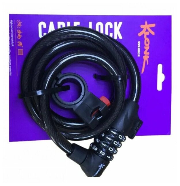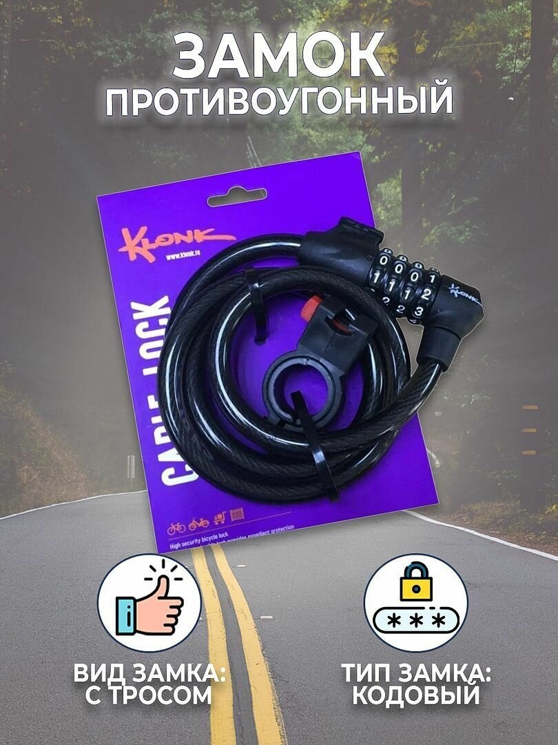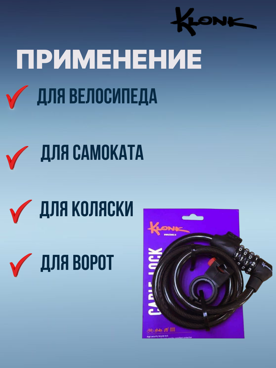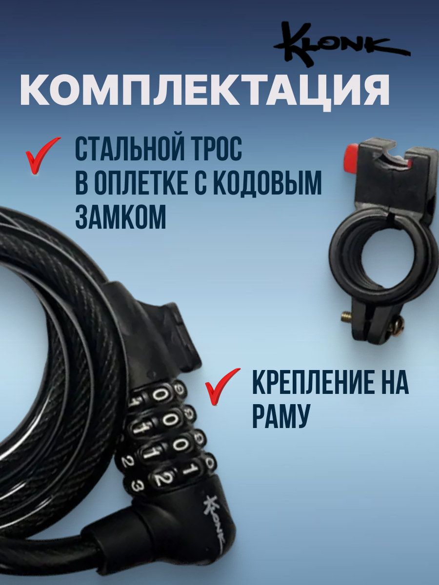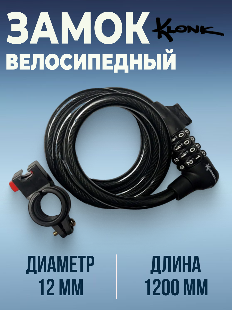 Замок противоугонный KLONK для велосипедов и самокатов кодовый 120 см, трос 12 мм, черный 10332