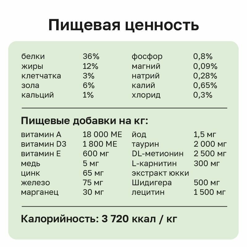 | Состав | мясо и его производные – 40 %, лосось – 5 %, протеины растительного происхождения (злаки, горох), клетчатка, витамины и минеральные вещества, омега-3 и омега-6 жирные кислоты, таурин, L-карнитин |