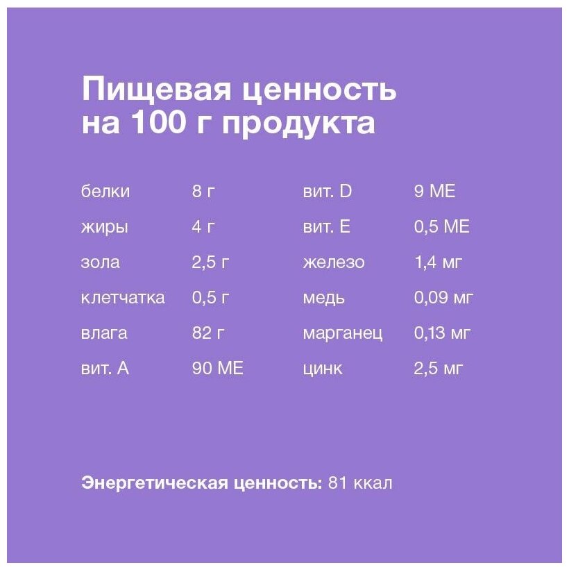 | Пищевая ценность | белки – 9 %, жиры – 3 %, зола – 2,5 %, клетчатка – 0,5 %, влажность – 82 % |