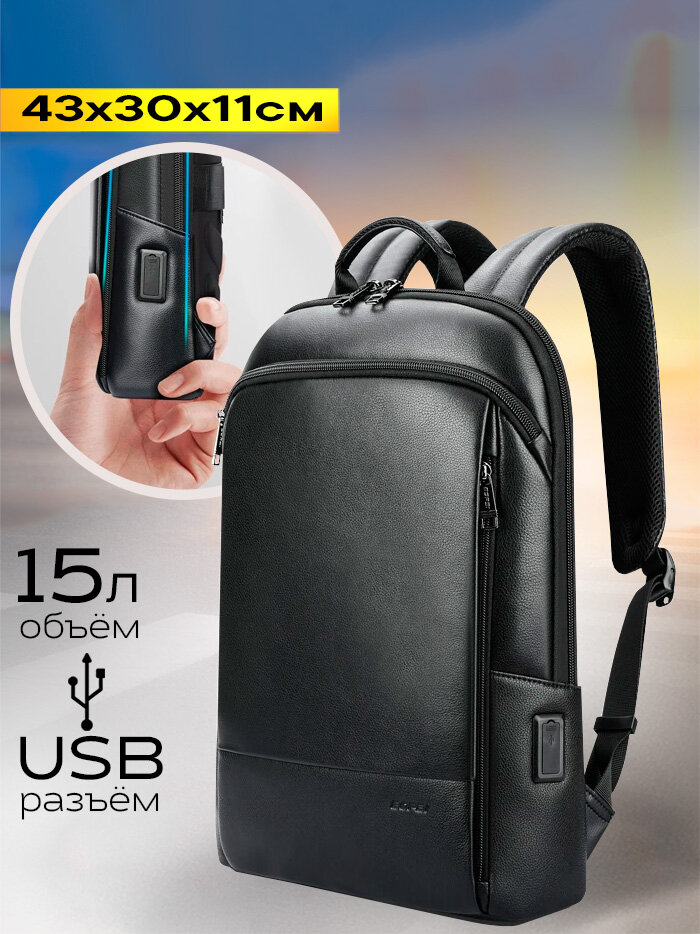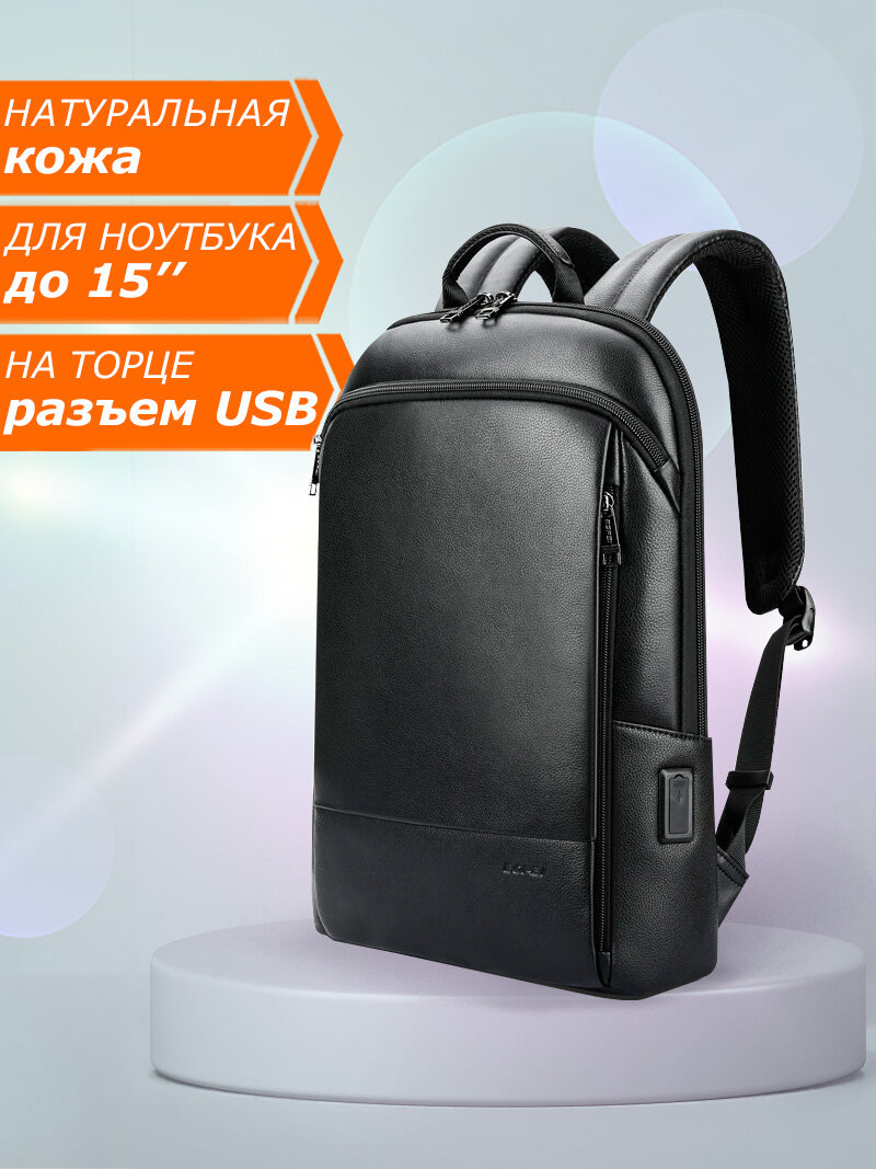 Рюкзак из натуральной кожи городской Bopai универсальный 15л, для ноутбука 15", с USB портом, влагостойкий, молодежный, черный