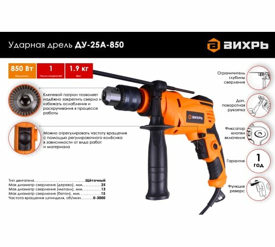 Дрель ударная сетевая ДУ-25А-850 Вихрь, 850Вт, ключевой патрон, реверс