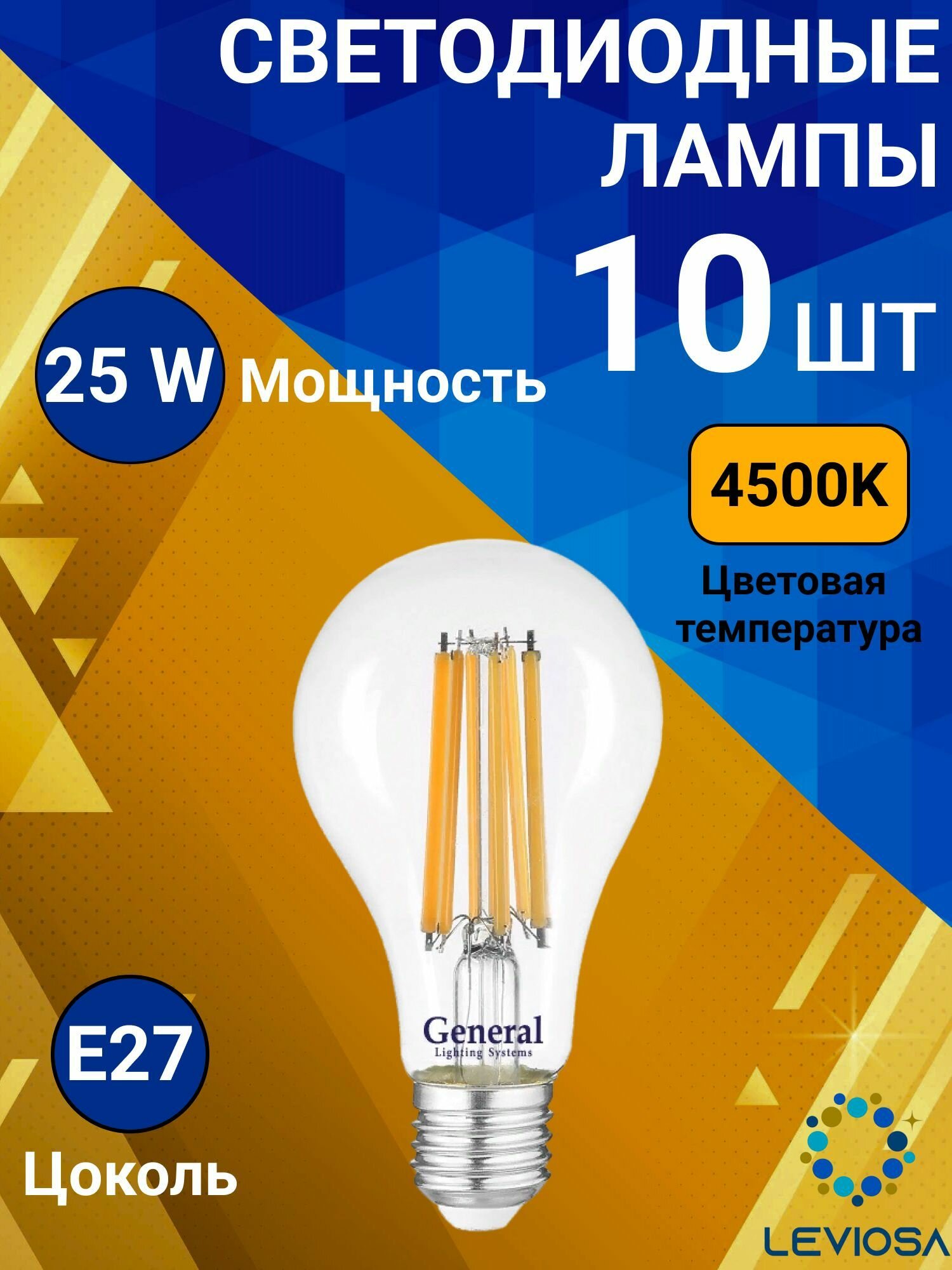 Светодиодные лампы филаментная, General, Комплект из 10 шт, Мощность 10 Вт, Цоколь E14, Нейтральный свет