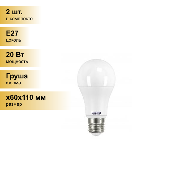 (2 шт.) Светодиодная лампочка General ЛОН A60 E27 20W 6500K 6K 60x110 пластик/алюмин. 690100 Холодный белый. Цоколь E27