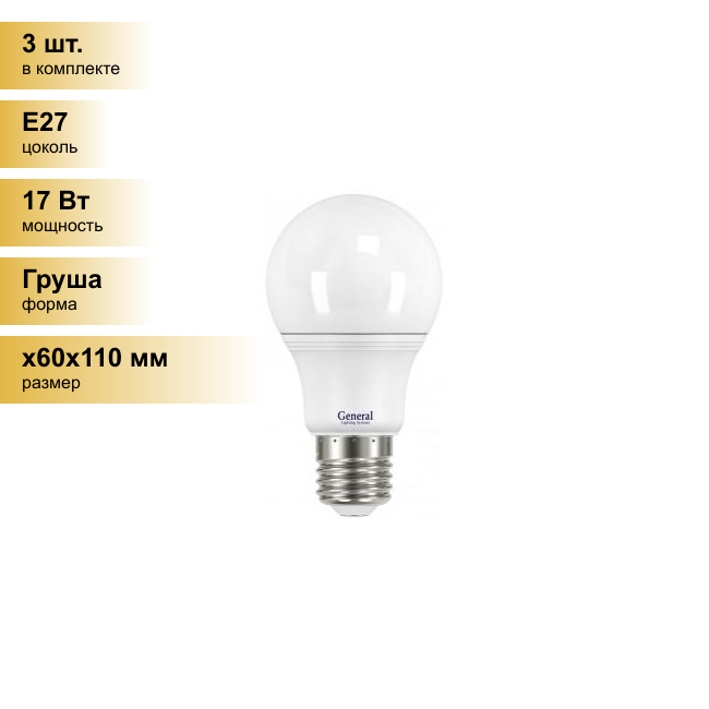 Лампочка светодиодная, General, Комплект из 3 шт, 17 Вт, Цоколь E27, 6500К, Форма лампы Груша, WA60