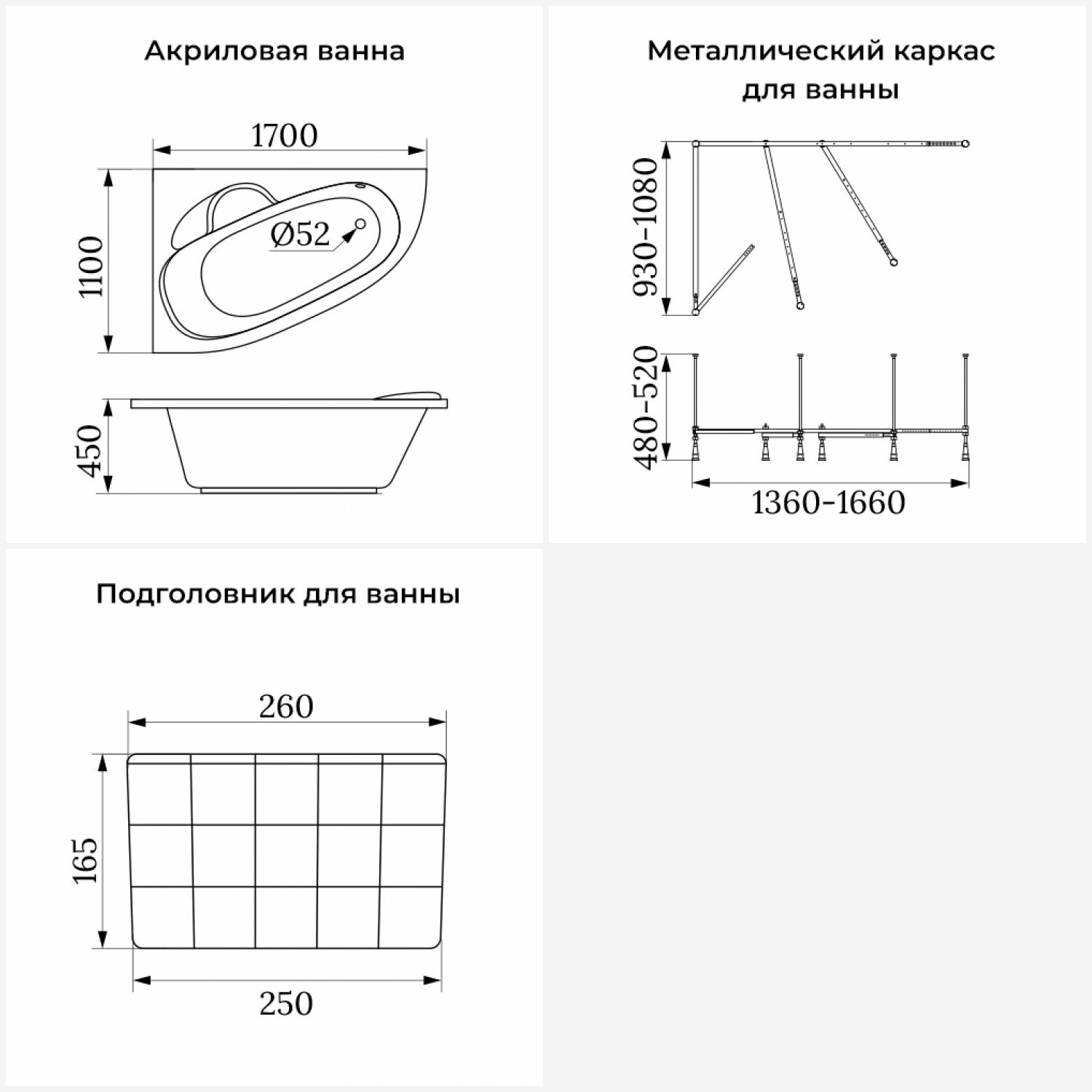 Акриловая ванна 170х110 см Lavinia Boho Bell Pro набор 3 в 1 S1-370217PR: угловая ванна (правый разворот), металлический каркас, подголовник