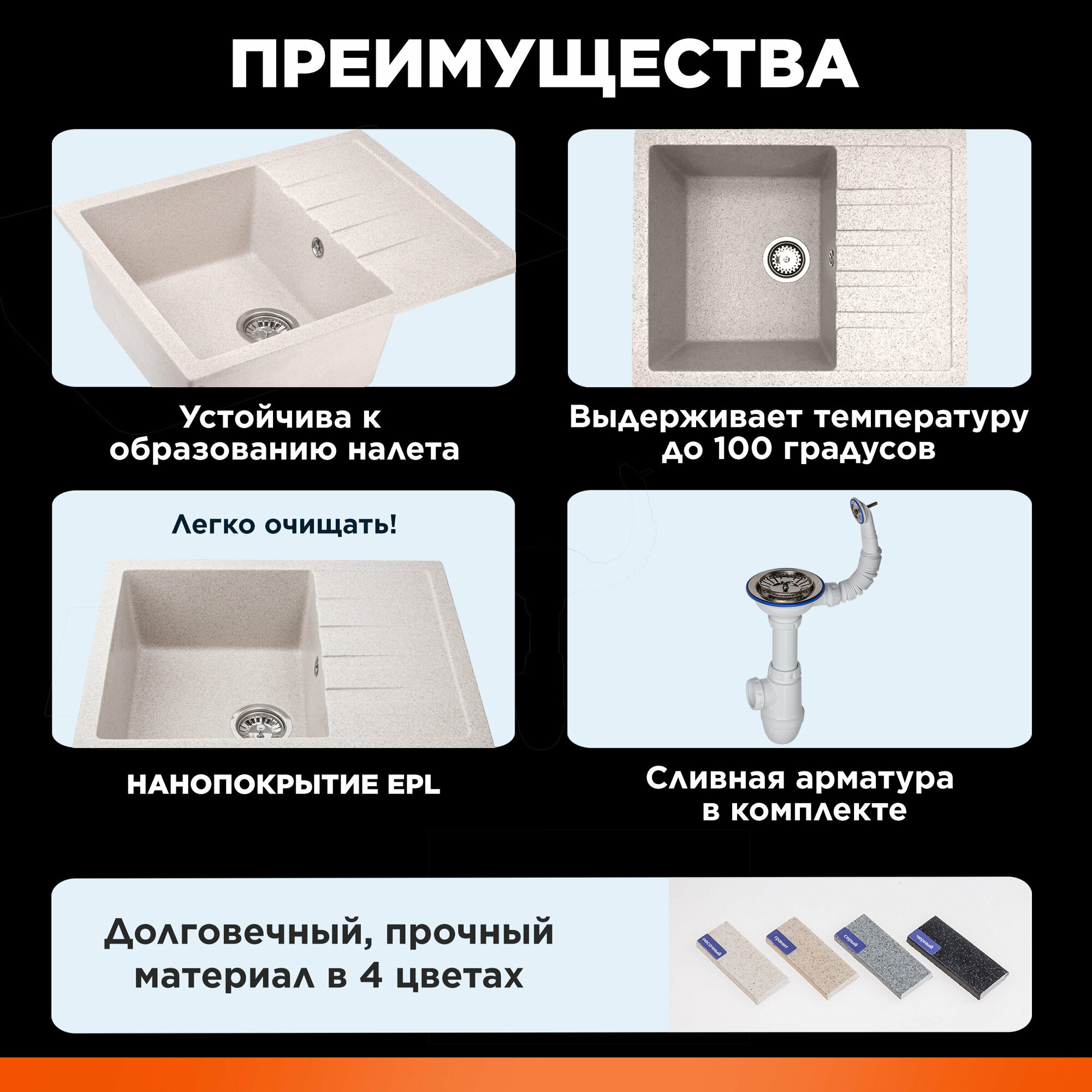 Мойка для кухни каменная AV ENGINEERING Unit 55х50, с сифоном (AVE550500BKA)
