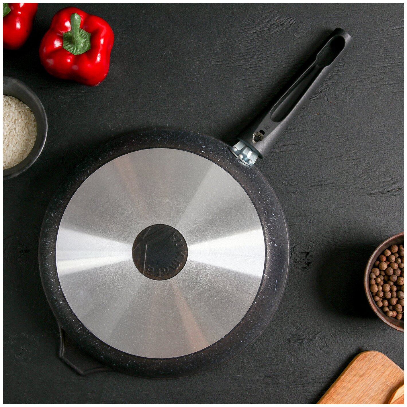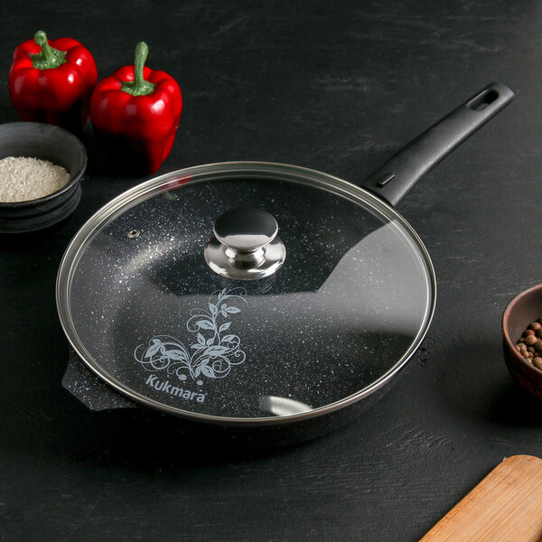 Сковорода, d=26 см съёмная ручка, стеклянная крышка, антипригарное покрытие, тёмный мрамор KUKMARA 4 .