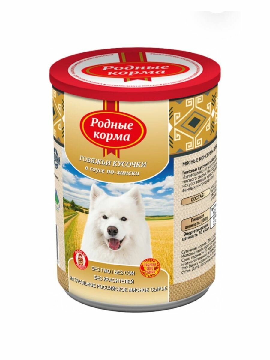 Родные Корма Консервы для собак говяжьи кусочки в соусе по-хански, 970 г