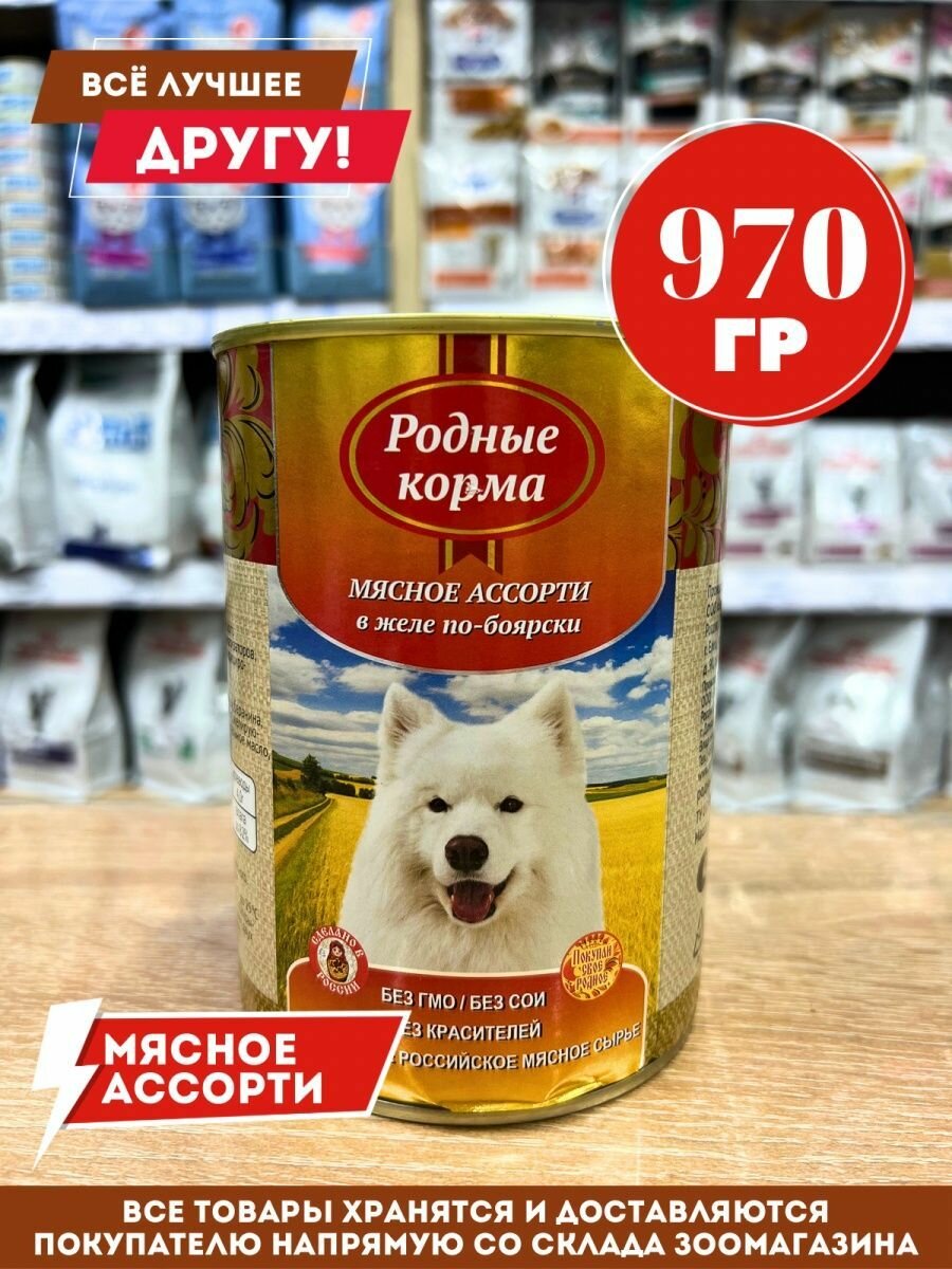 Влажный корм родные корма консервы для собак Мясное Ассорти в Желе По Боярски 970 гр