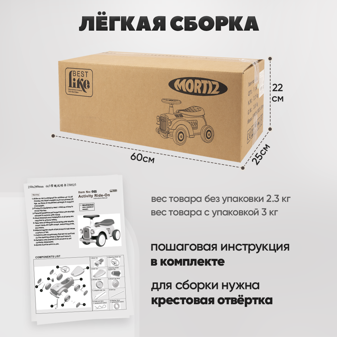 | Дополнительная информация | диаметр колёс 14.5 см; высота до руля: 44 см; высота до сидения: 25 см; сидение пластиковое: 24х15.5 см; музыкальный руль 2 кнопки: звук зажигания и сигнал; светящаяся фара; защита от опрокидывания; батарейки в комплект не входят |
