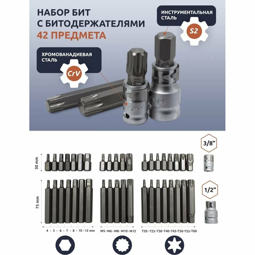 ROCK-FORCE RF-4421 Набор бит Т20-60 H4-H12 М5-12 с держателем 42 предмета в кейсе ROCKFORCE