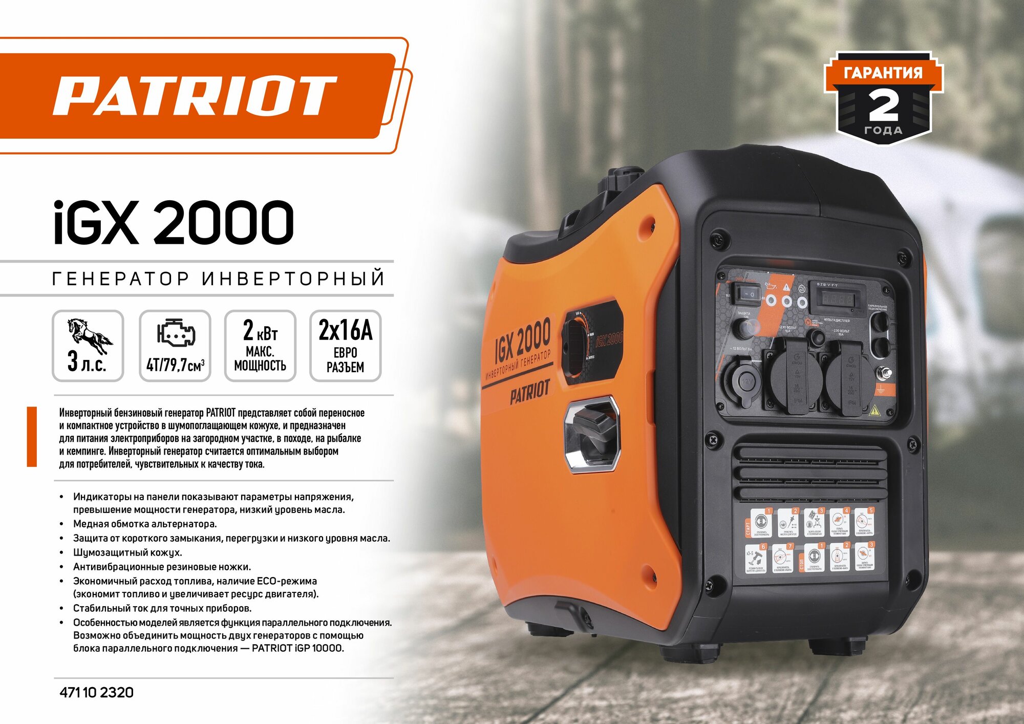 Инверторный генератор PATRIOT iGX 2000, ном. 1,8 кВт / макс. 2 кВт (арт. 471102320)