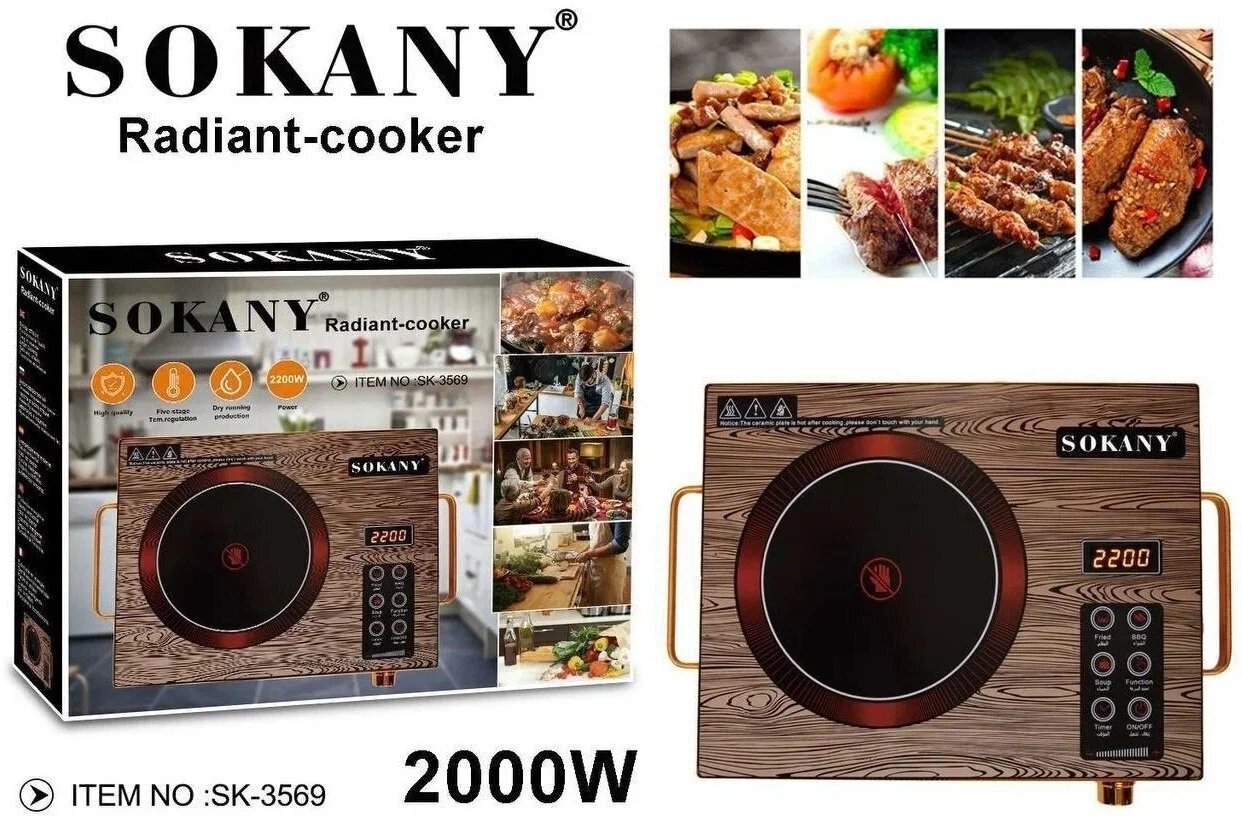 Инфракрасная одноконфорочная плита Sokany SK-3569/экономична в эксплуатации/сенсорное управление/LIGHT WEIGHT/с ЖК-дисплеем/имеет две зоны нагрева/коричневый