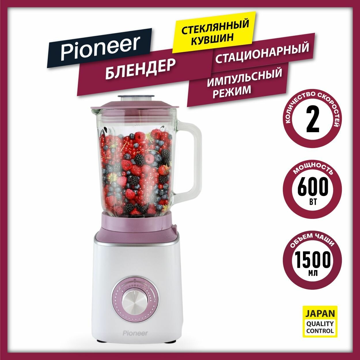 Стационарный блендер Pioneer, импульсный режим, 2 скорости, стеклянный кувшин 1,5 литра, 6-лепестковый нож из нержавеющей стали, 600 Вт