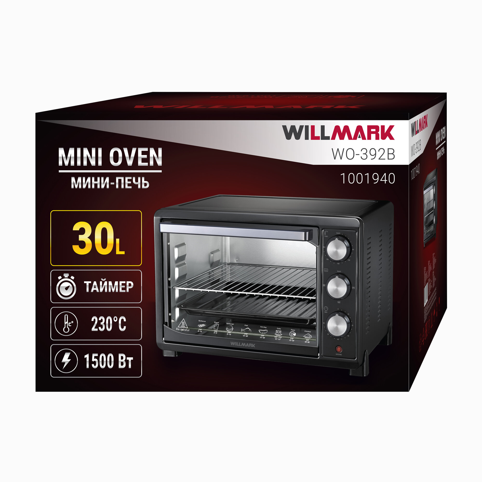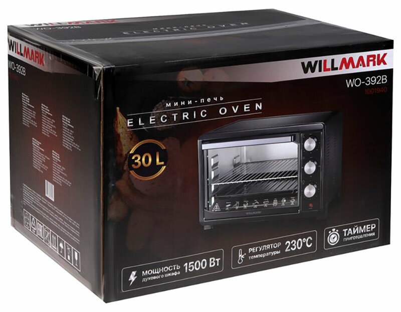 Мини-печь электрическая WILLMARK WO-392B (30 литров, таймер, термостат,230С, 1500Вт, чёрный)