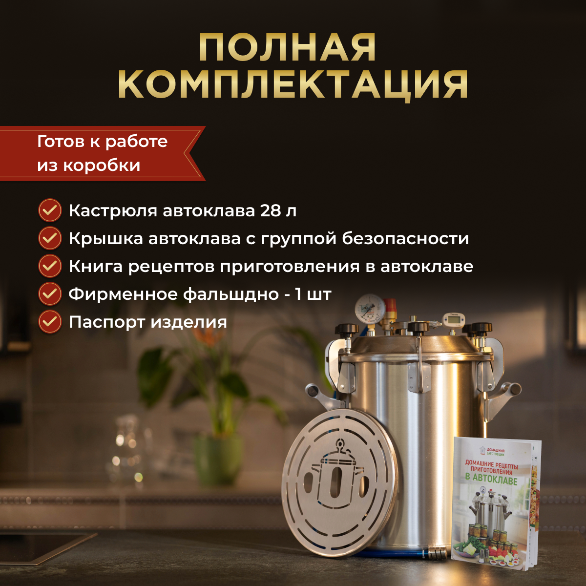 | Подробная комплектация | автоклав паровой для консервирования домашний, фальшдно для автоклава, манометр, аварийный клапан, цифровой термометр, паспорт с инструкцией, книга рецептов |