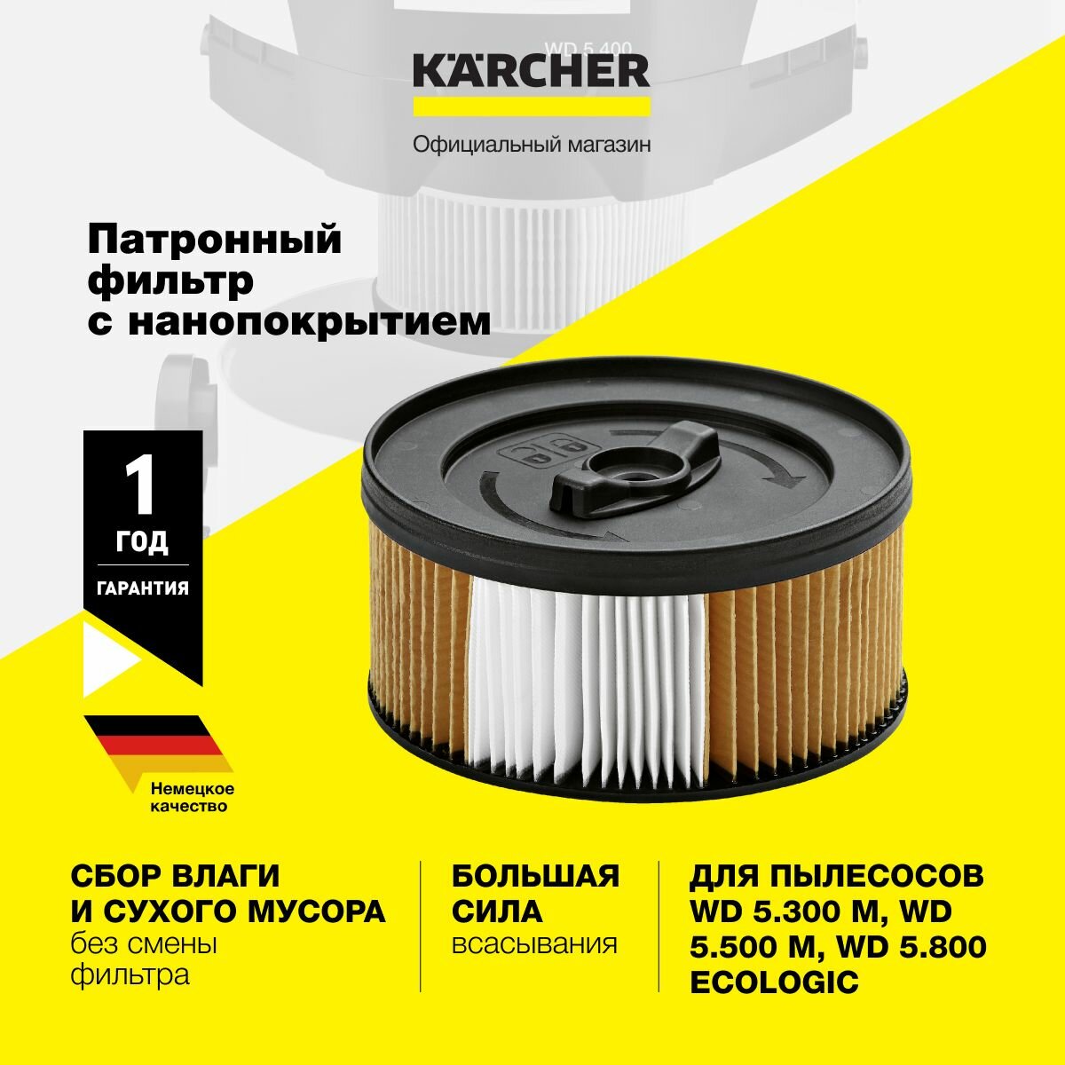 Патронный фильтр с нанопокрытием для пылесосов WD (4.200, 4.250, 5.200, 5.300, 5.400, 5.470,5.500M, 5.800 eco!ogic, 5.600 MP) Karcher