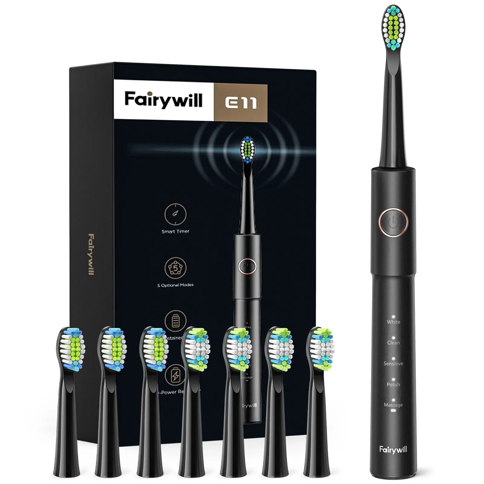 Электрическая зубная щетка Fairywill E11, 8 сменных насадок, 5 режимов для чистки полости рта,черная