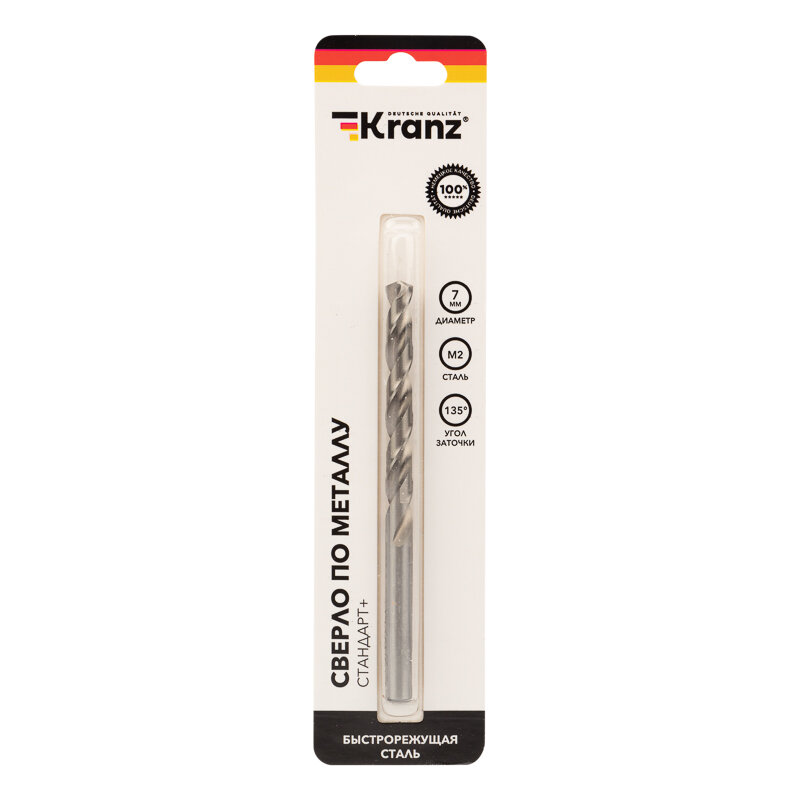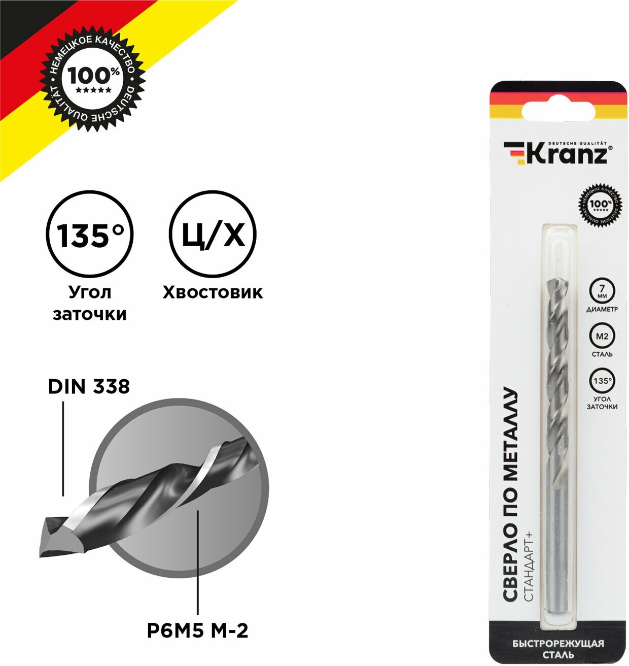 Сверло по металлу KRANZ 7 мм Стандарт+ из быстрорежущей стали P6M5 M-2, в упаковке 1 шт., стандарт DIN 338