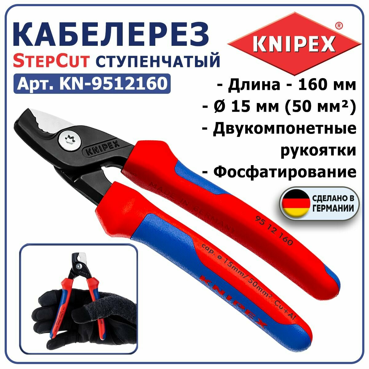 Кабелерез KNIPEX StepCut, ступенчатый рез, d 15 мм (50 кв. мм.), длина 160 мм, 2-комп ручки KN-9512160