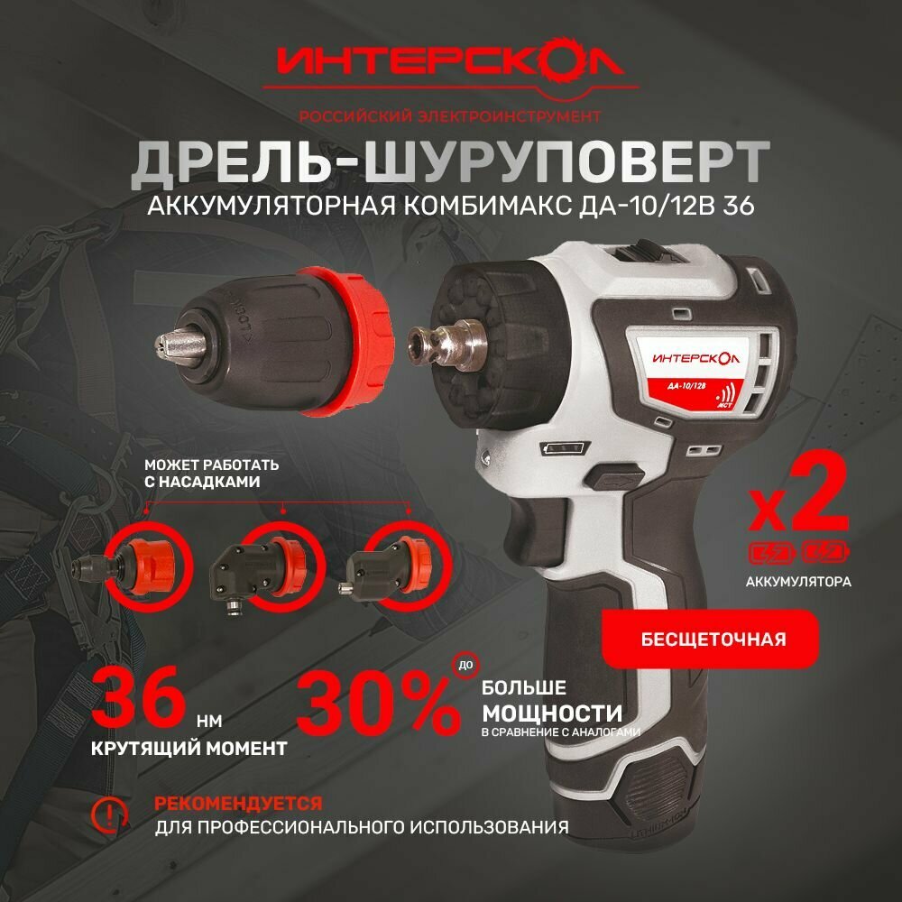 Аккумуляторная бесщеточная дрель-шуруповерт ИНТЕРСКОЛ ДА-10/12В 36 (сумка, 2 аккум., 2Ач, ЗУ, патрон св.) комбимакс