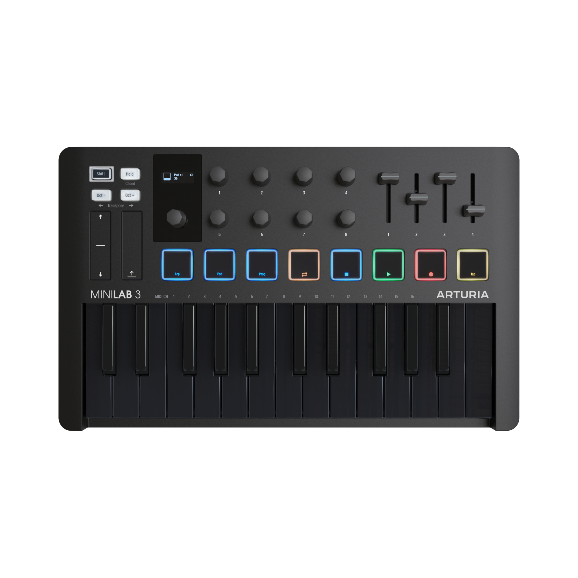 Arturia MiniLAB 3 Deep Black - 25 клавишная MIDI-клавиатура - пэд-контроллер, 9 регуляторов, 8 RGB пэдов, 8 фейдеров, дисплей, сенсорные регуляторы Pitch/Modulation, MIDI-выход, 1/4" Jack вход педали, режим Chord, арпеджиатор, USB-C, ПО
