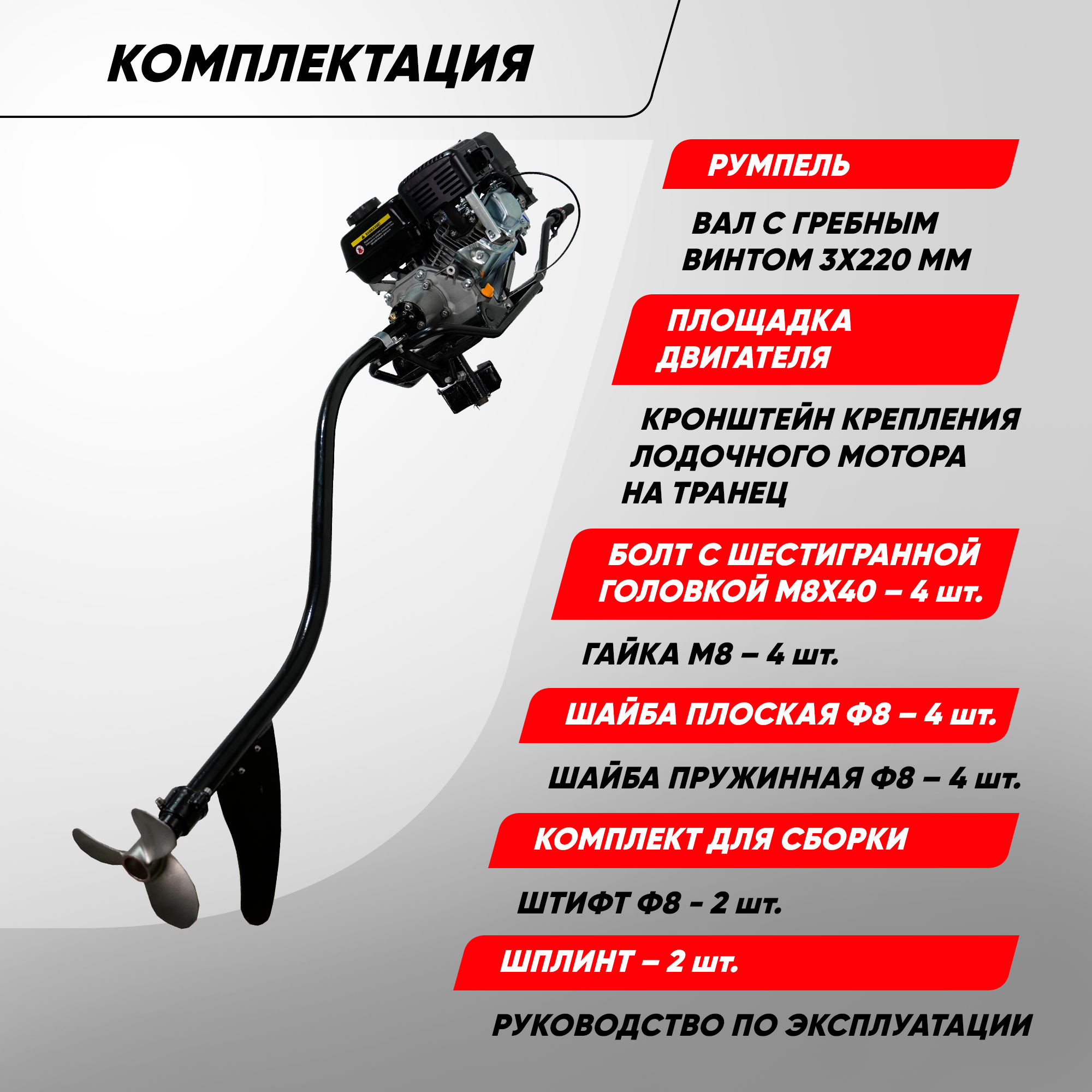 | Минусы: | Разобранный комплект, ножка отдельно. Инструкция не информативна. Болты для крепления ноги к мотору не подошли, пришлось покупать отдельно. Сборка заняла 4 часа. Ножка не смазана, рекомендаций по смазки нет (использовал смазку для ШРУС). Все указатели - подсос, увеличение тяги на ручке перепутаны с точностью наоборот. Требует модернизации перед использованием. Желательно заменить румпельную ручку на какую-то кастомную, в комплекте не удобная и тяжелая. |