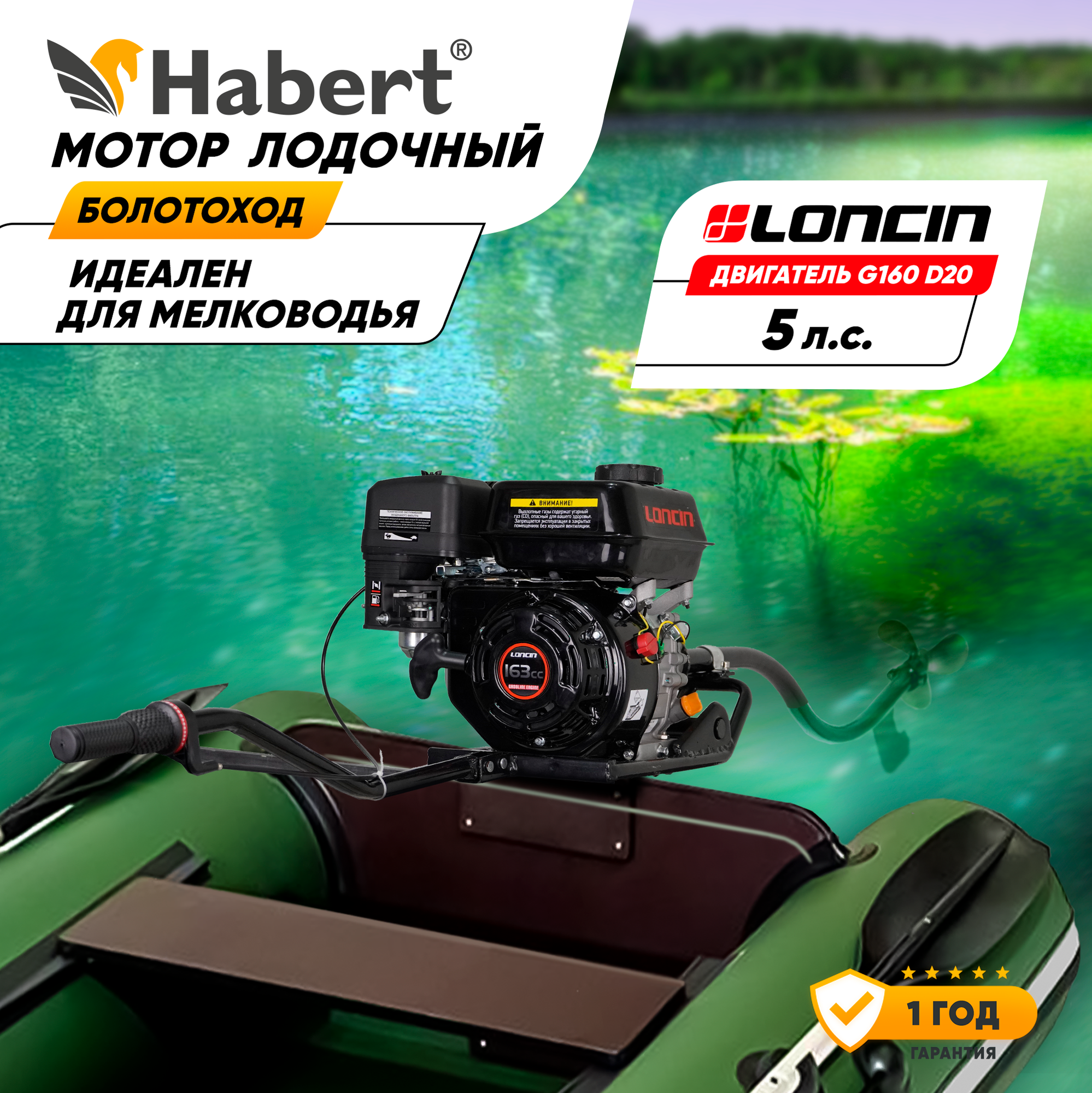 Мотор лодочный болотоход Habert (двигатель Loncin G160 D20), 5 л.с., 163 куб.см, ручной старт, 4-х тактный интересное: