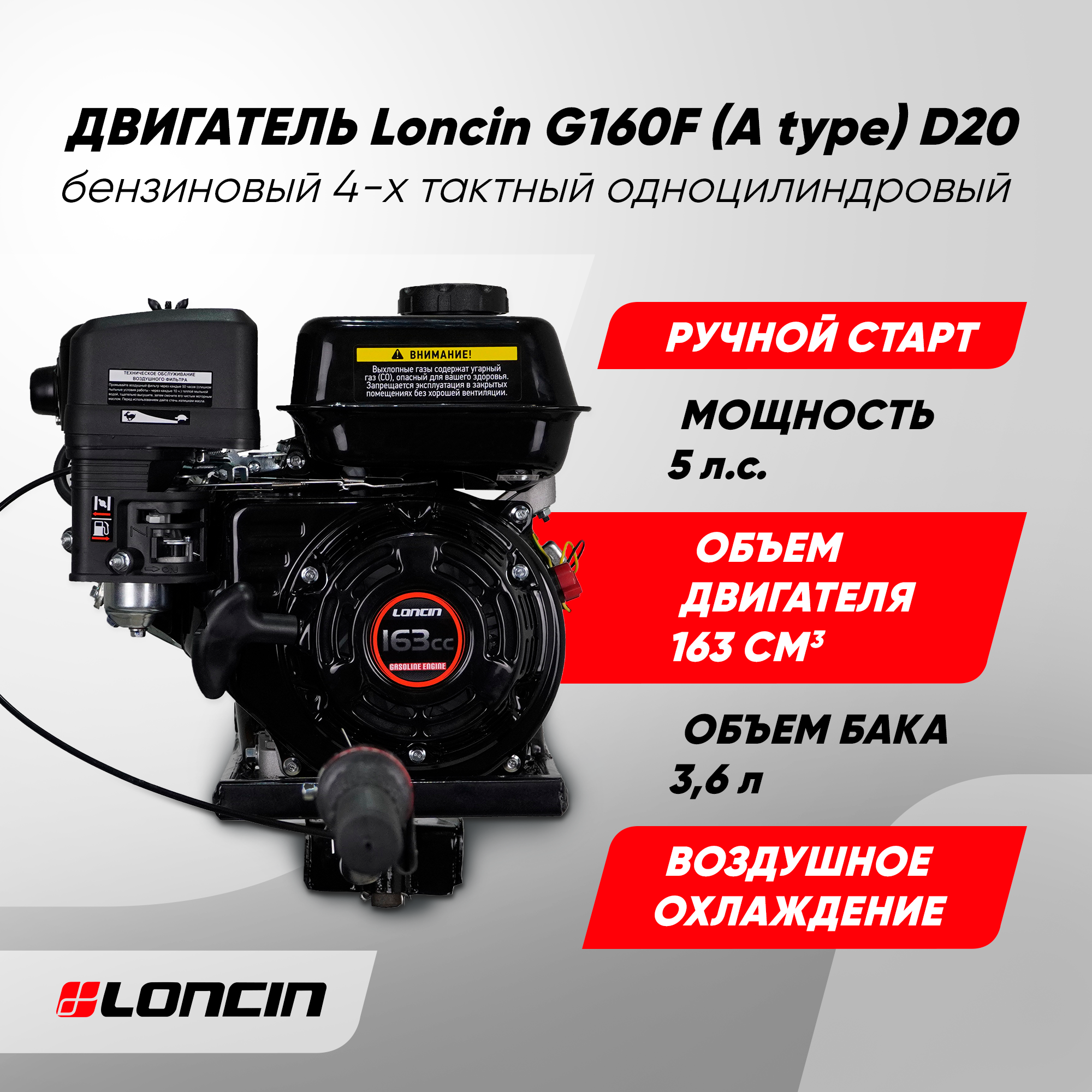 Мотор лодочный бензиновый болотоход Loncin (G160, 5л.с., 163куб. см, вал 20мм, ручной старт, 4-х тактный)