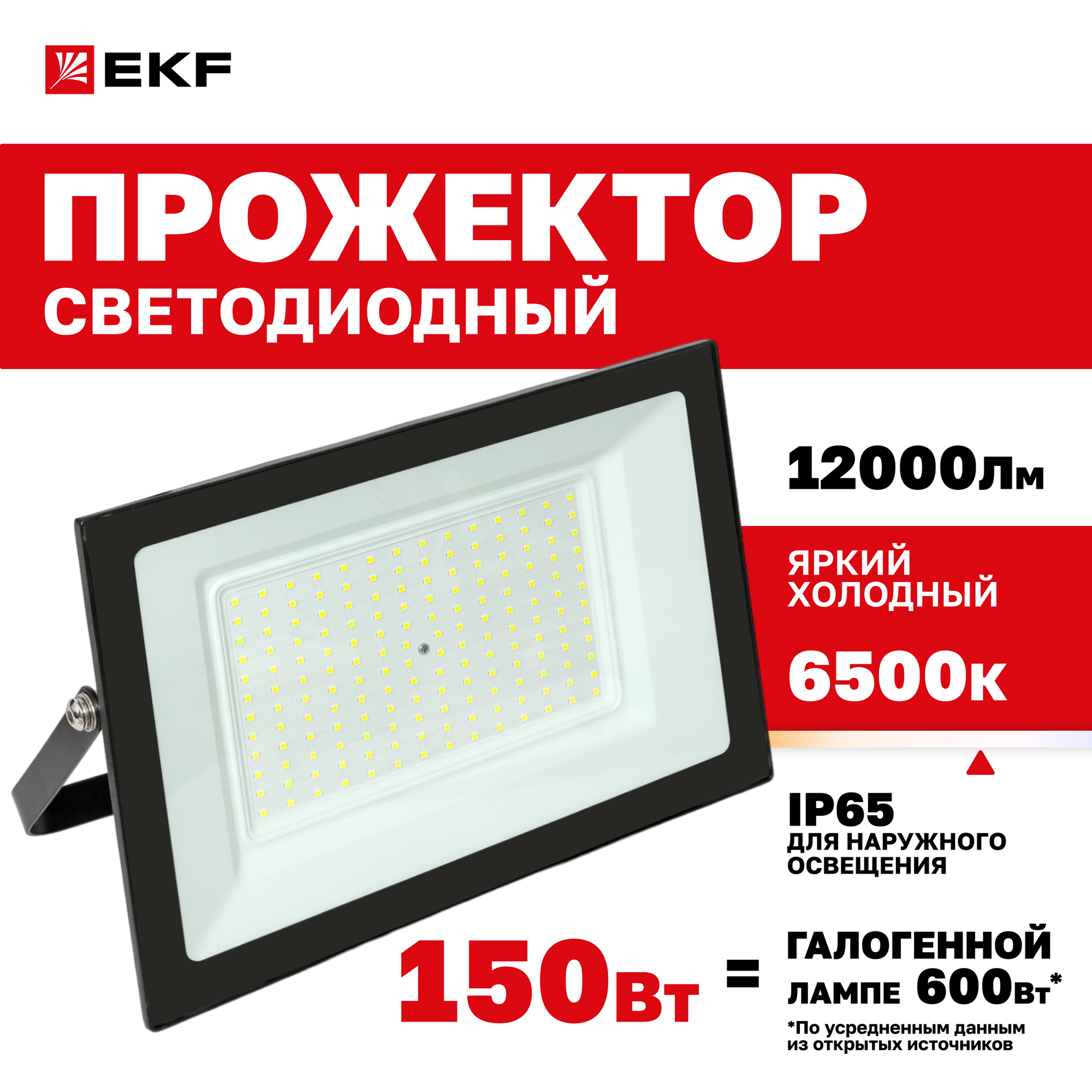 Прожектор светодиодный СДО-3007 150Вт 6500К IP65 LUMA EKF, световой поток 12000Лм, что соответствует галогеновой лампе мощностью 600Вт*