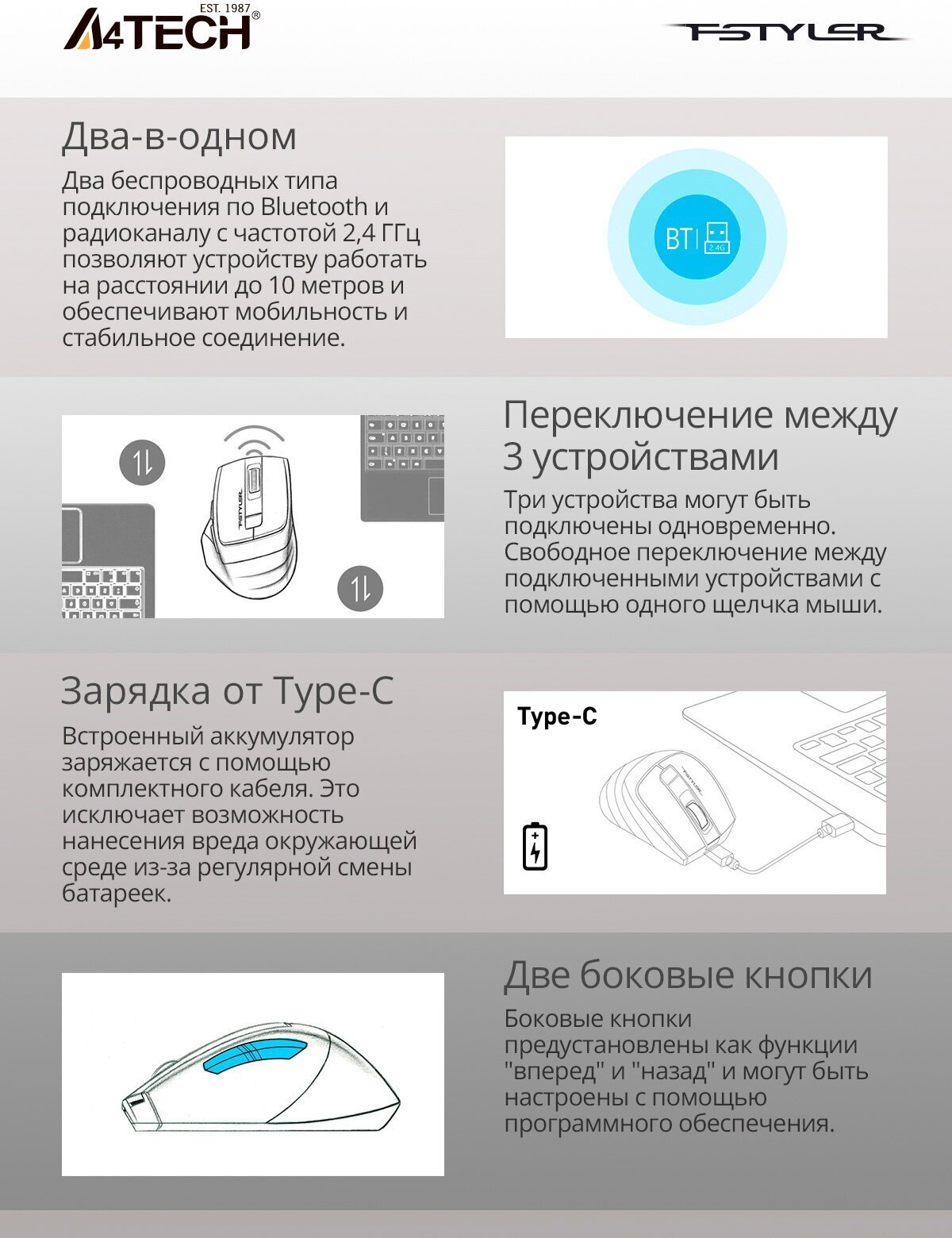 Ниже Вы можете прочитать отзывы на Мышь A4Tech Fstyler Fb35c серый/черный оптическая (2400dpi) беспроводная BT/Radio USB (6but) Fb35c ., ознакомится с подробными характеристиками, посмотреть интересные обзоры и фотографии на Мышь A4Tech Fstyler Fb35c серый/черный оптическая (2400dpi) беспроводная BT/Radio USB (6but) Fb35c ..