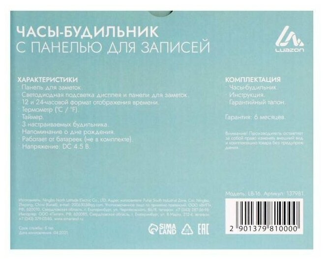 СохранитьЧасы - будильник Luazon LB-16"Послание", с маркером, подсветка зеленого цвета, белый Luazon Home 137 . интересное: