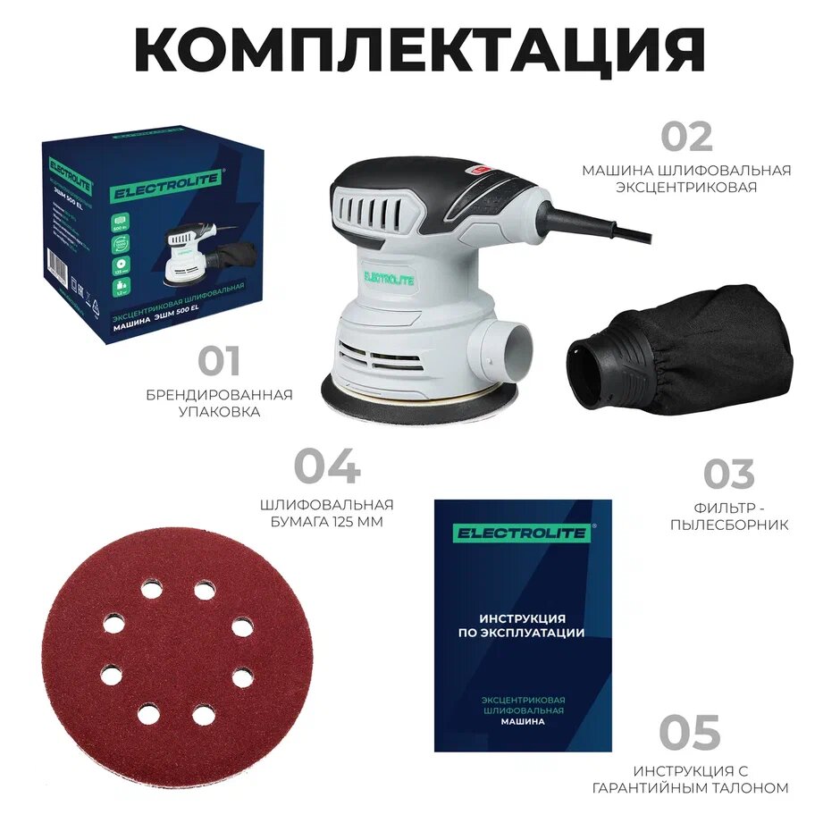 Шлифмашинка эксцентриковая / Шлифовальная машинка / Шлифовальная машинка по дереву / Electrolite ЭШМ 500 EL 125 мм, 500 Вт, 6000-12000 об/мин
