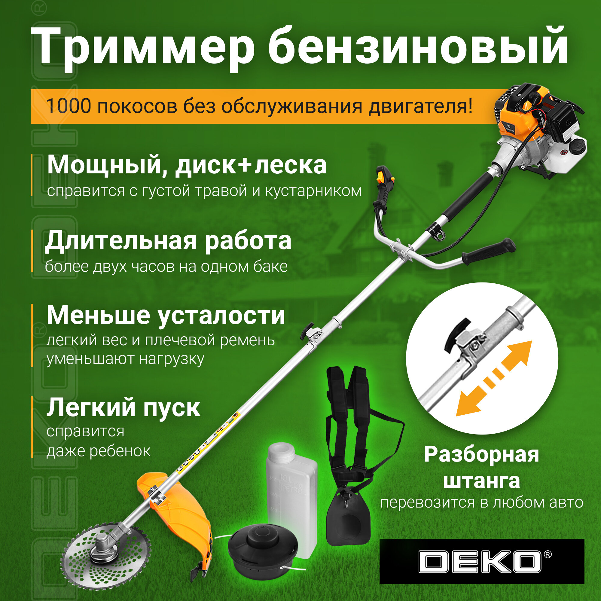 Ниже Вы можете прочитать отзывы на Триммер бензиновый DEKO DKTR52 SET 7, 2200Вт, 3000-8500 об/мин, леска/диск, ознакомится с подробными характеристиками, посмотреть интересные обзоры и фотографии на Триммер бензиновый DEKO DKTR52 SET 7, 2200Вт, 3000-8500 об/мин, леска/диск.