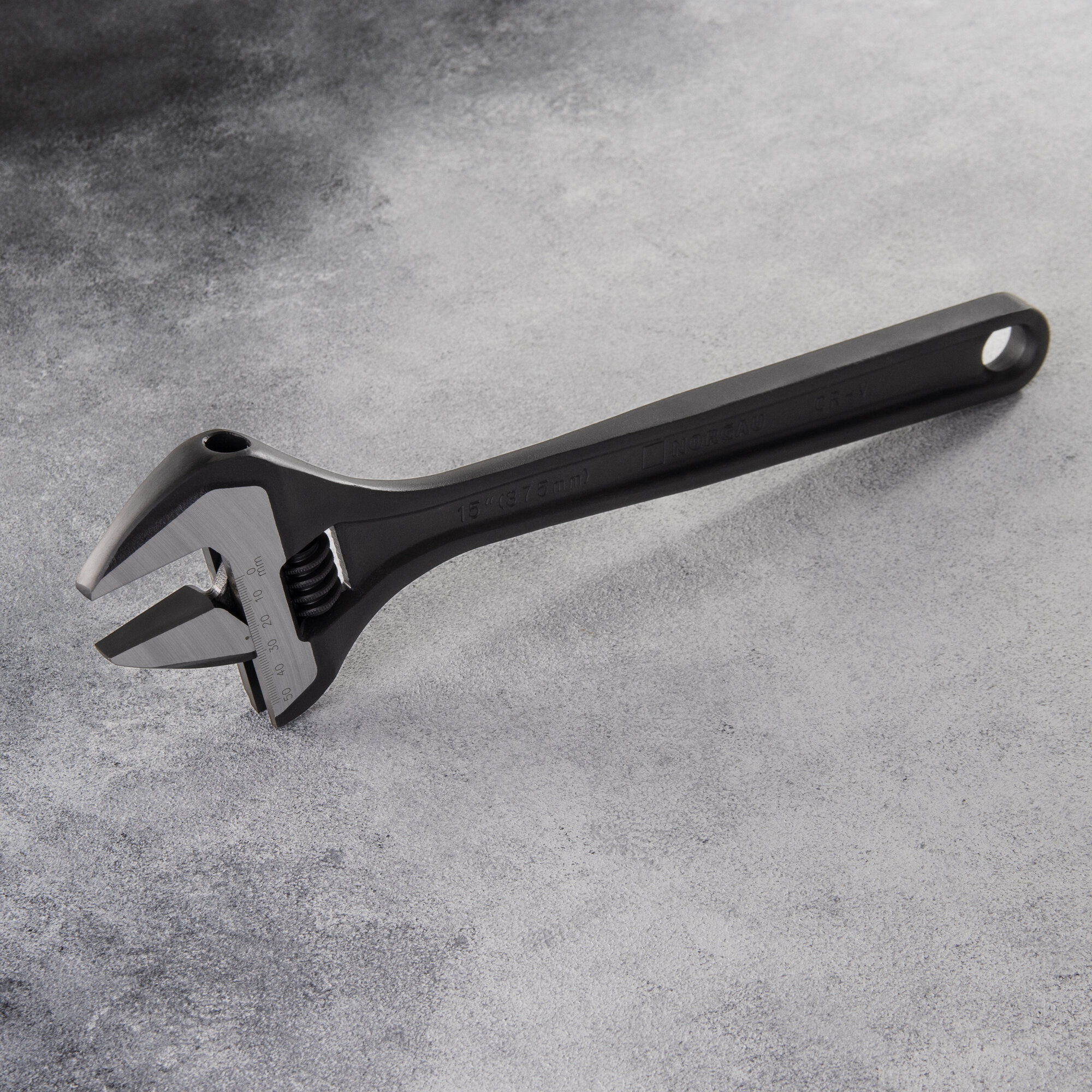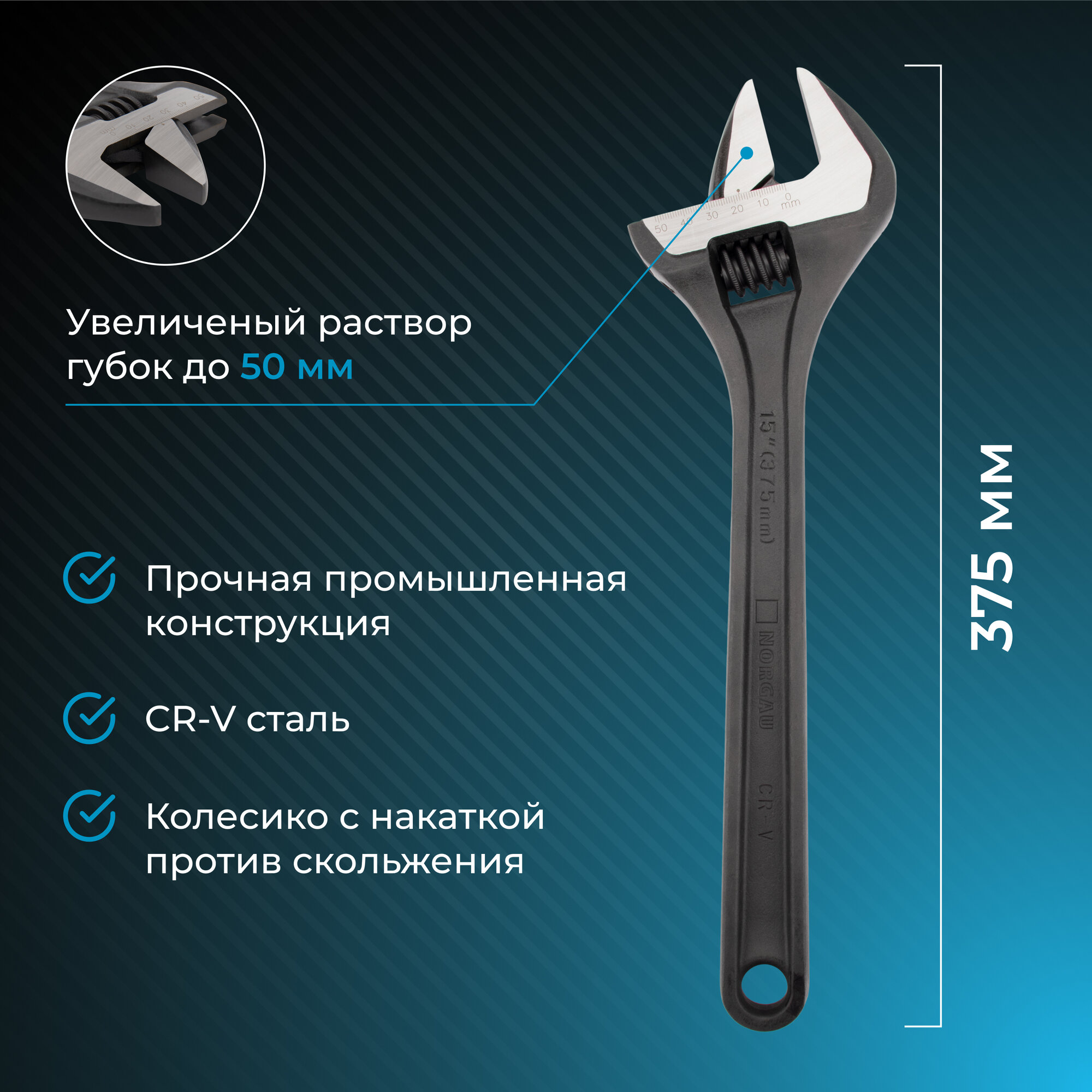 Разводной гаечный ключ NORGAU Industrial 15" с раскрытием 50 мм из закаленной легированной стали, 375 мм