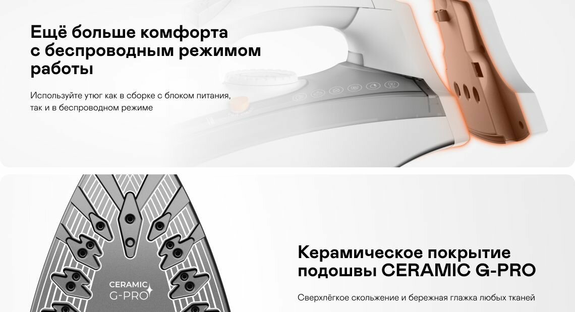 | Минусы: | Поскольку подошва не тяжелая, теплоемкость у неё небольшая. В беспроводном режиме пользоваться не очень, поскольку быстро остывает. |