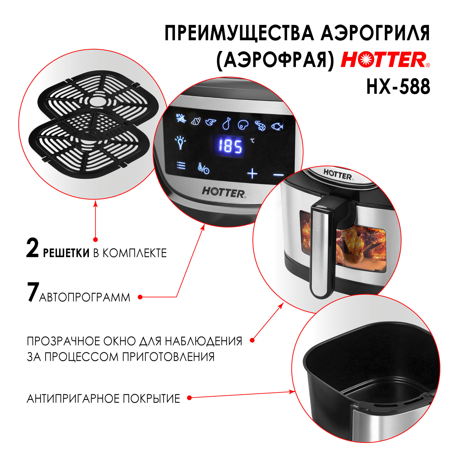 Купить Аэрогриль HOTTER HX-588, объем 4.5л, 7 автопрограмм , регулировка времени и температуры, обзорное окно, черный/ металлик