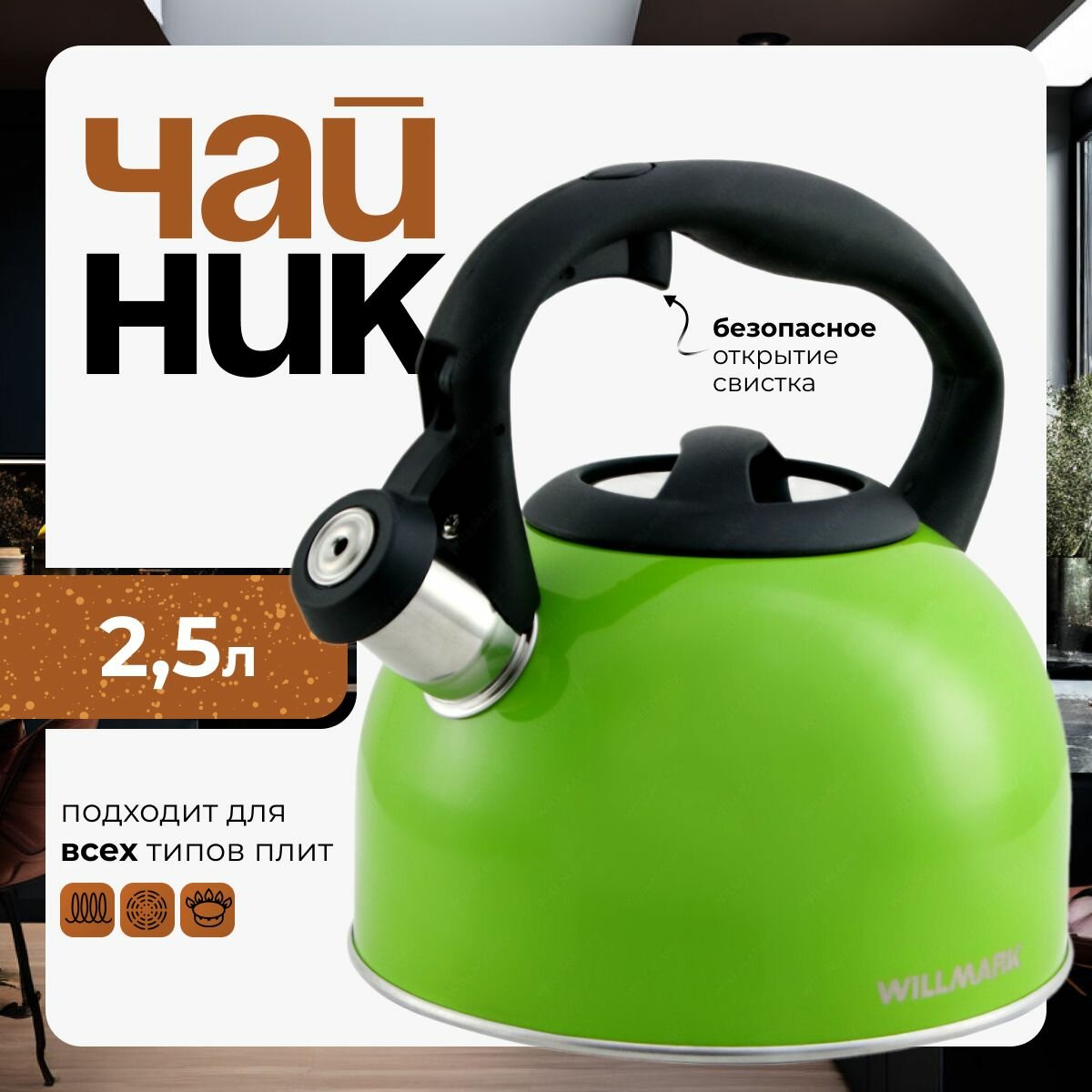 Купить Чайник WILLMARK WTK-3229SS зеленый, со свистком, 2.5л, для плиты