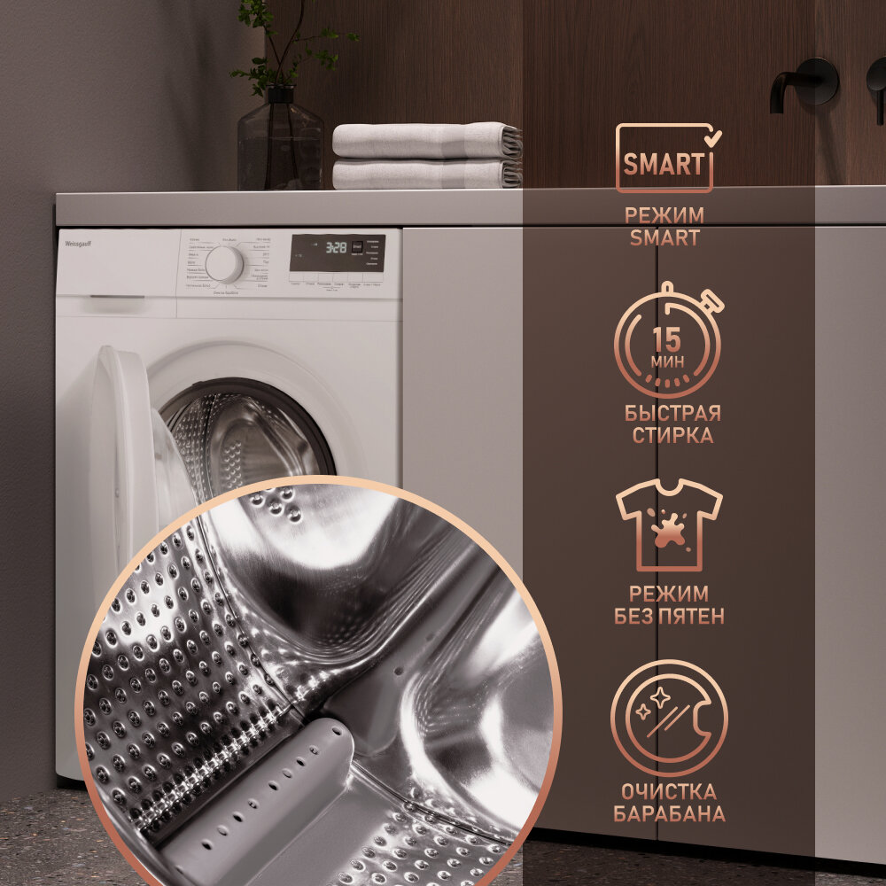 Cтиральная машина с паром Weissgauff WM 46106 Steam,3 года гарантии, глубина 45 см, 6 кг, 16 программ, Умная стирка, Быстрая стирка 15 мин, Дозагрузка белья, А+ интересное:
