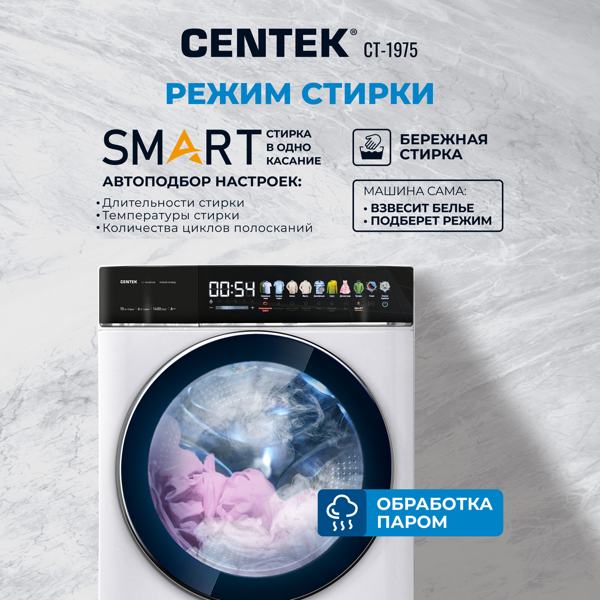 Стиральная машина Centek CT-1975 (с сушкой) прямой привод, сенсорное управление, инверторный двигатель, подсветка барабана, обработка озоном, загрузка 10 кг