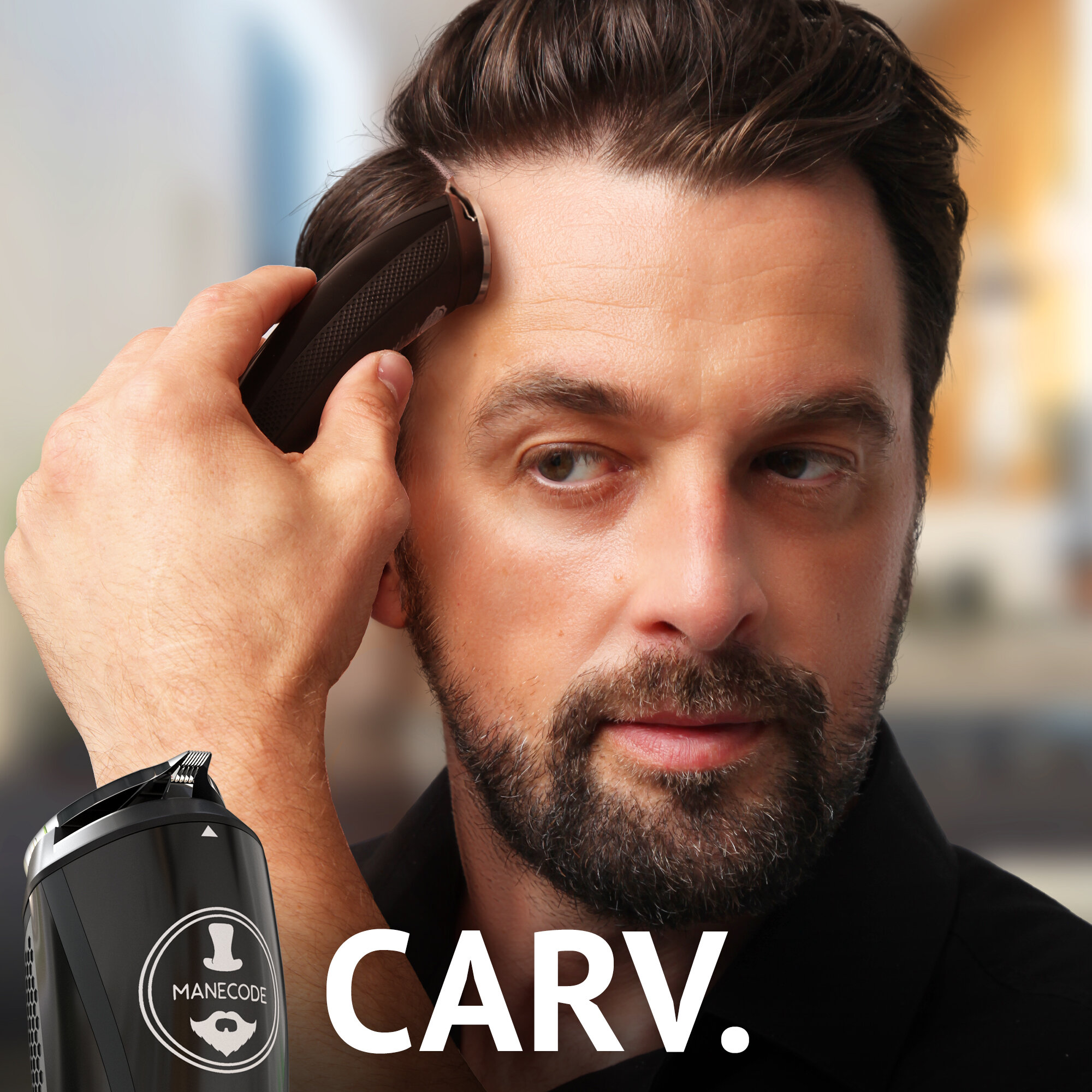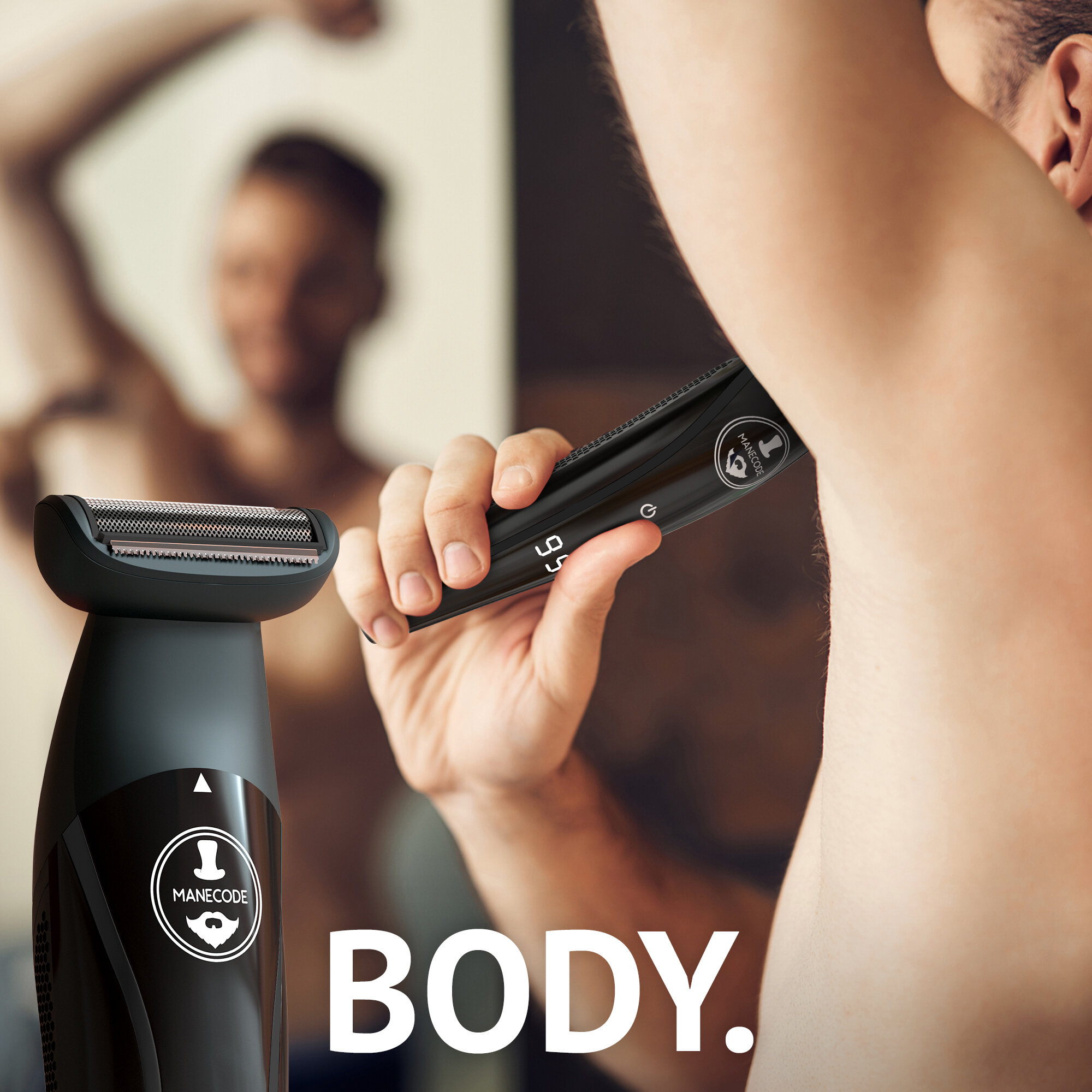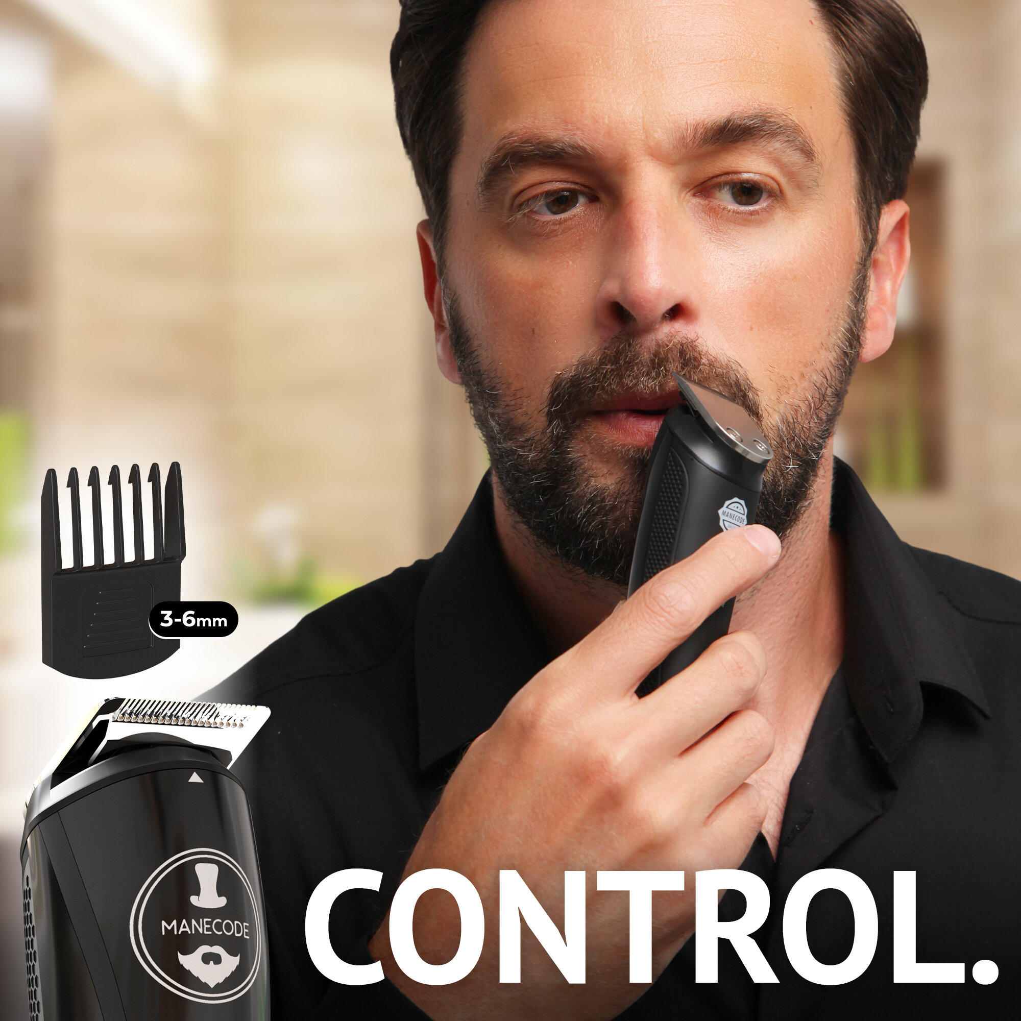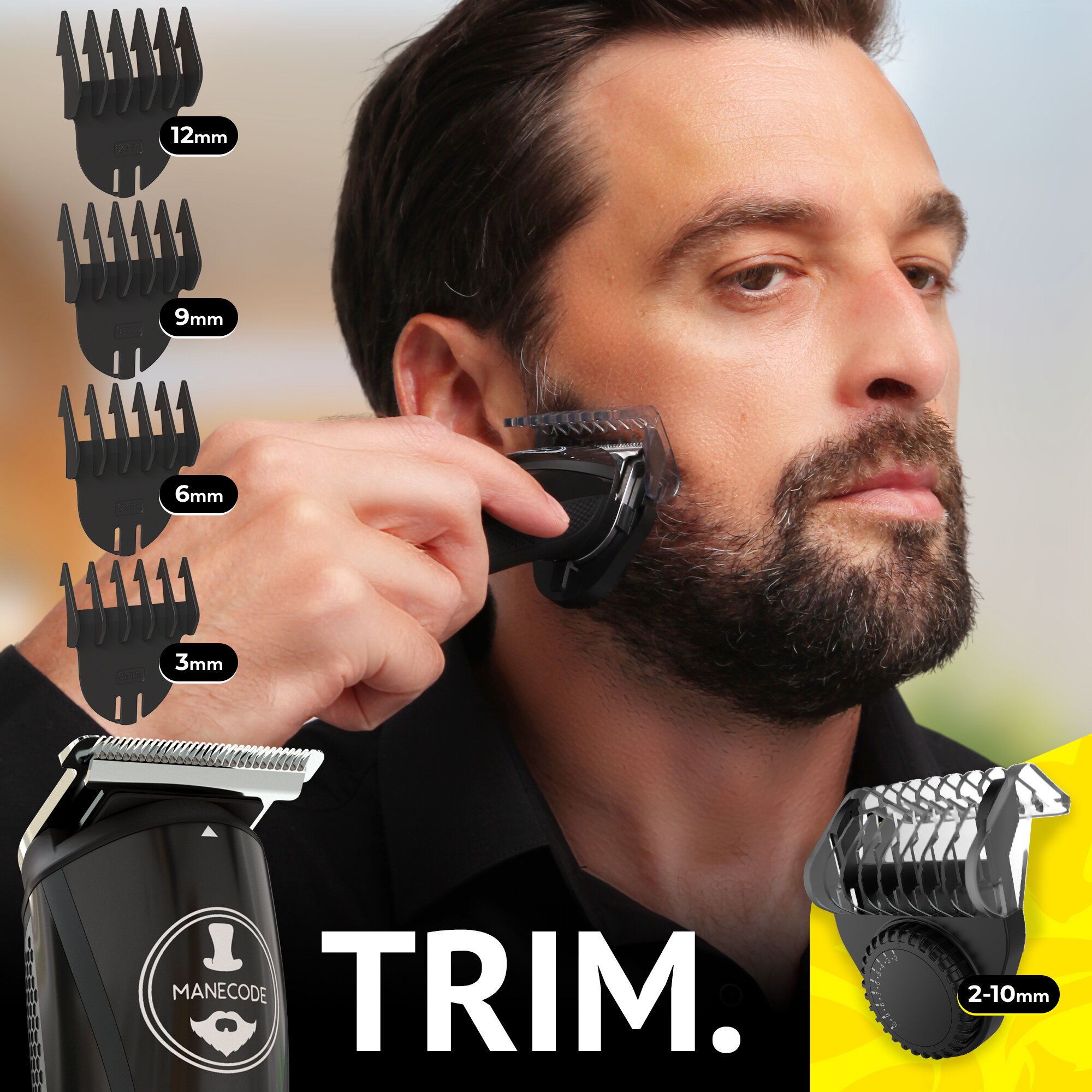 Триммер для бороды и усов Manecode BLACK BARBA 12 в 1 с насадками для носа, ушей и тела и регулируемой насадкой SHAVE PRO, в комплекте фартук и трафарет для бритья