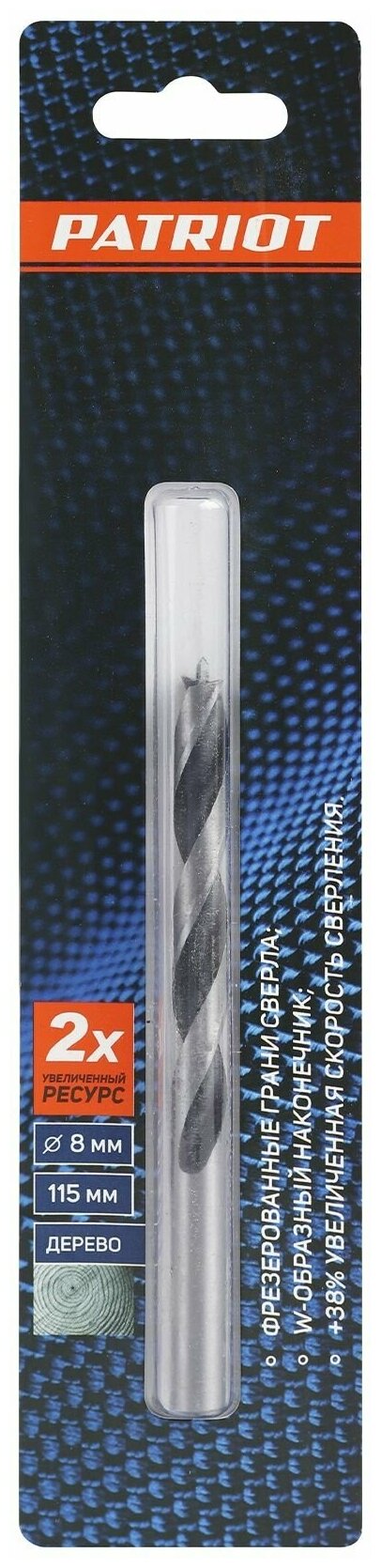 Сверло EDGE by PATRIOT по дереву спиральное 8 мм, W-образная заточка, 1 шт в блистере
