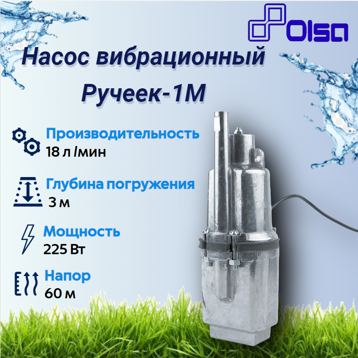 Насос вибрационный, Ручеек, верхний забор, 25 м, 225 Вт, глубина погружения 3 м, максимальный напор 60 м, 1.5 м³/ч, медь, Ручеек-1