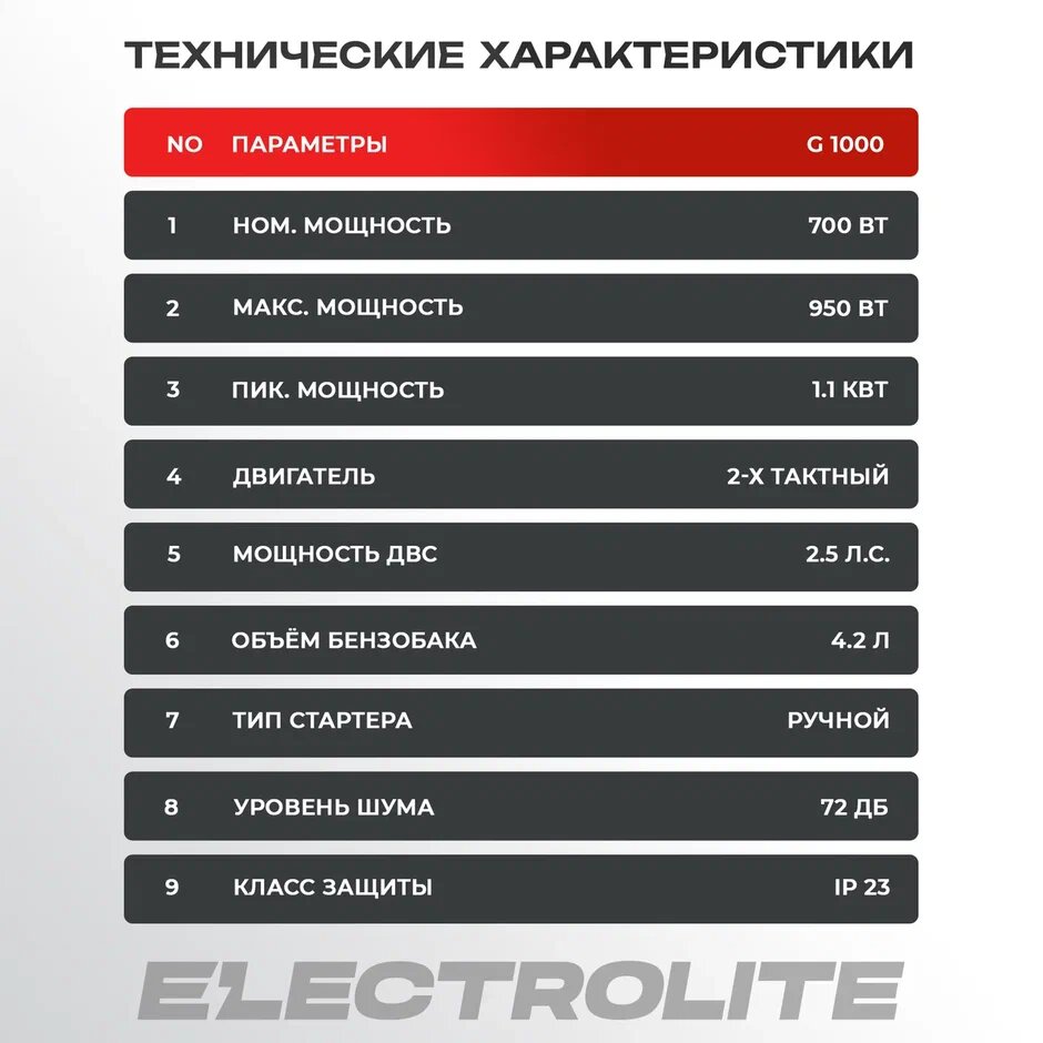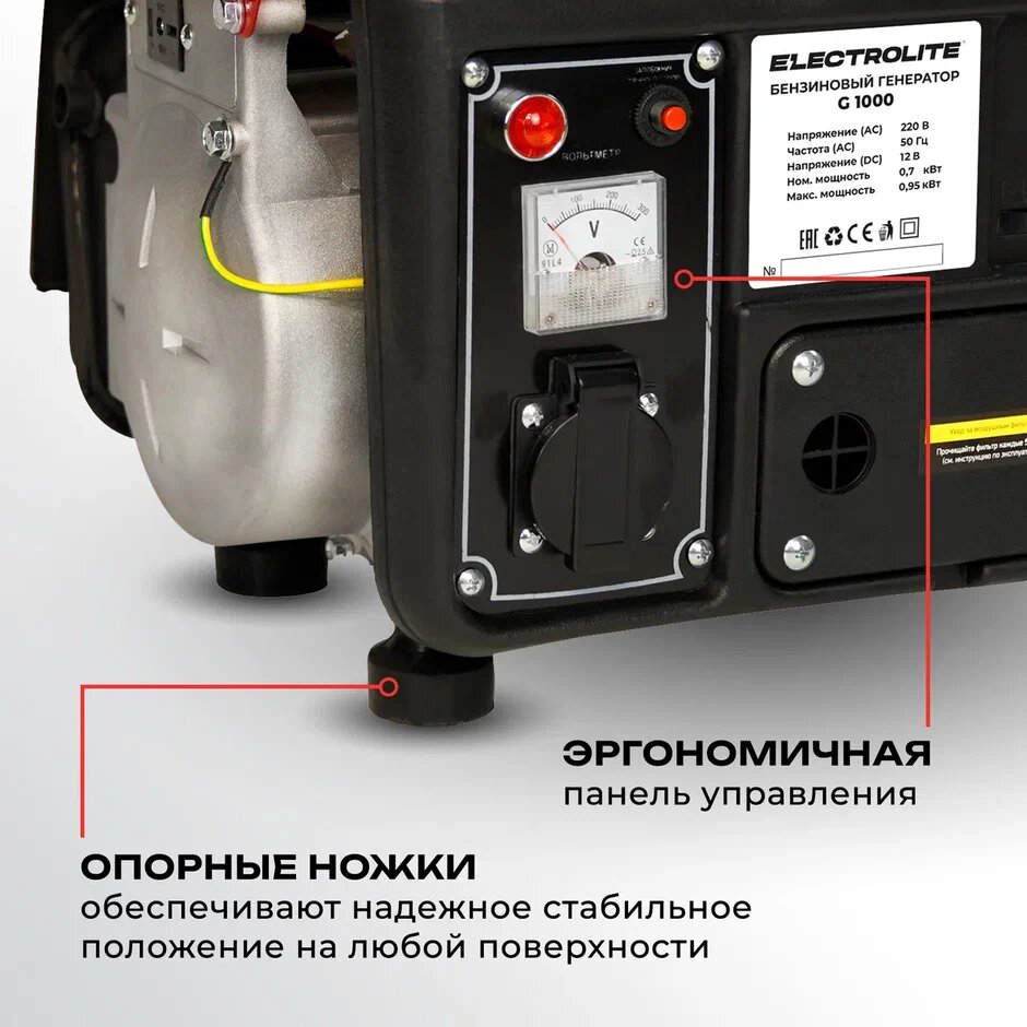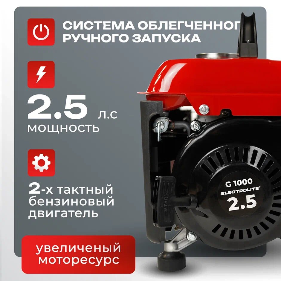 Бензиновый генератор Electrolite G1000 ( 1.18 кВа максимальная нагрузка 2.5 л.с, ручной стартер) интересное: