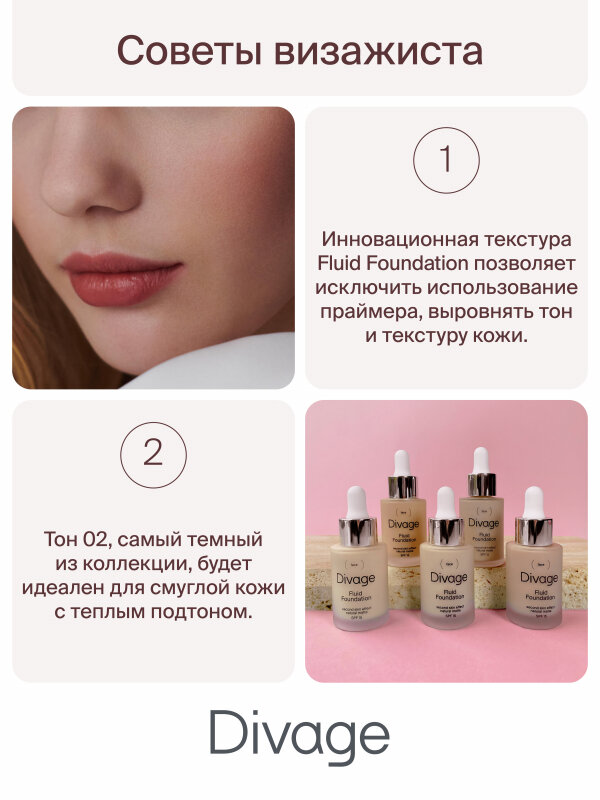 СохранитьDivage Fluid Foundation Тональный крем-флюид для лица, Тон 02 интересное: