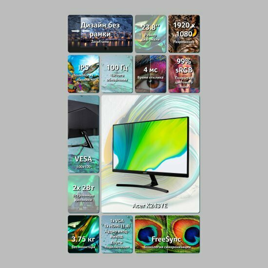 Монитор Acer Монитор 23,8 " ACER K243YEbmix IPS 23,8 ", 1920x1080, 4ms, 250cd, 100Hz, 1xVGA + 1xHDMI(1.4) + Audio In/Out, Speakers 2Wx2, FreeSync ZeroFrame, Black