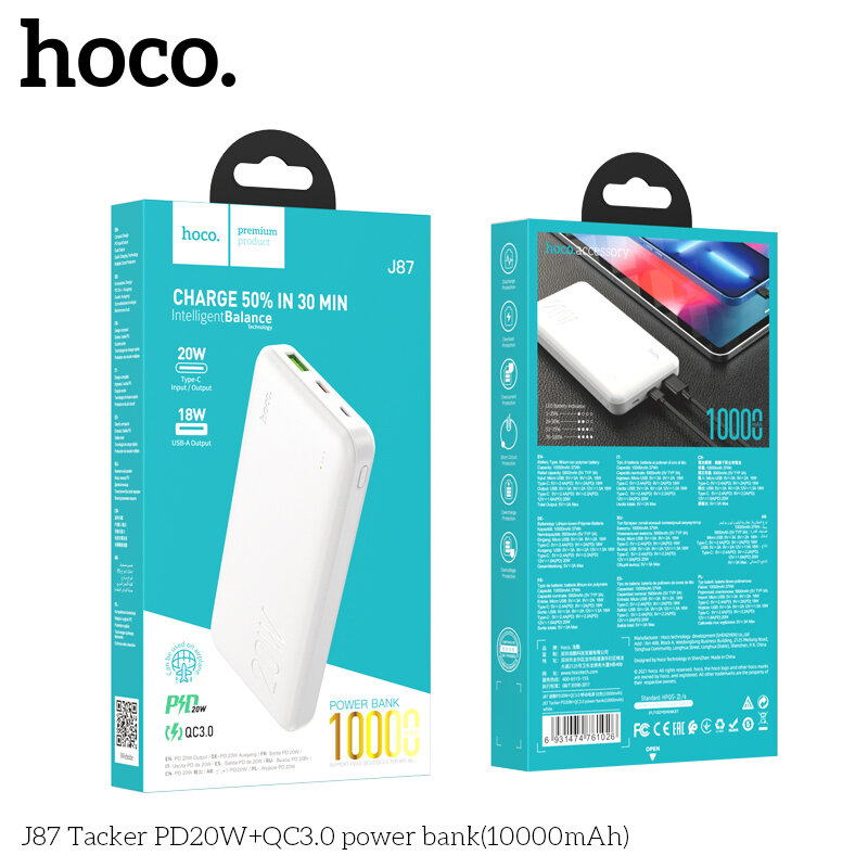 Портативный аккумулятор Hoco J87 Tacker, PD20W+QC3.0, 10000mAh, белый