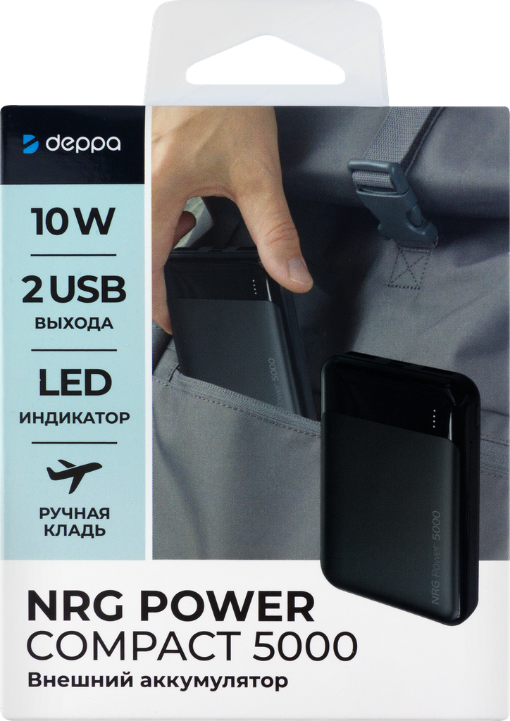 Внешний аккумулятор NRG Power 5000 mAh, 2A, 2xUSB, компактный, черный, Deppa, Deppa 33629