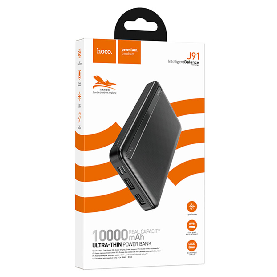 Купить Универсальный Доп. Аккумулятор 10000mAh, J91, HOCO, выход 2 USB (2.1A), вход Micro/Type-C, черный