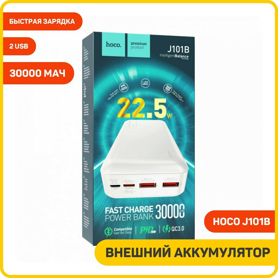 Купить Универсальный Доп. Аккумулятор 30000mAh, J101B, HOCO, выход: 2 USB (22.5W)+1 PD (20W), белый